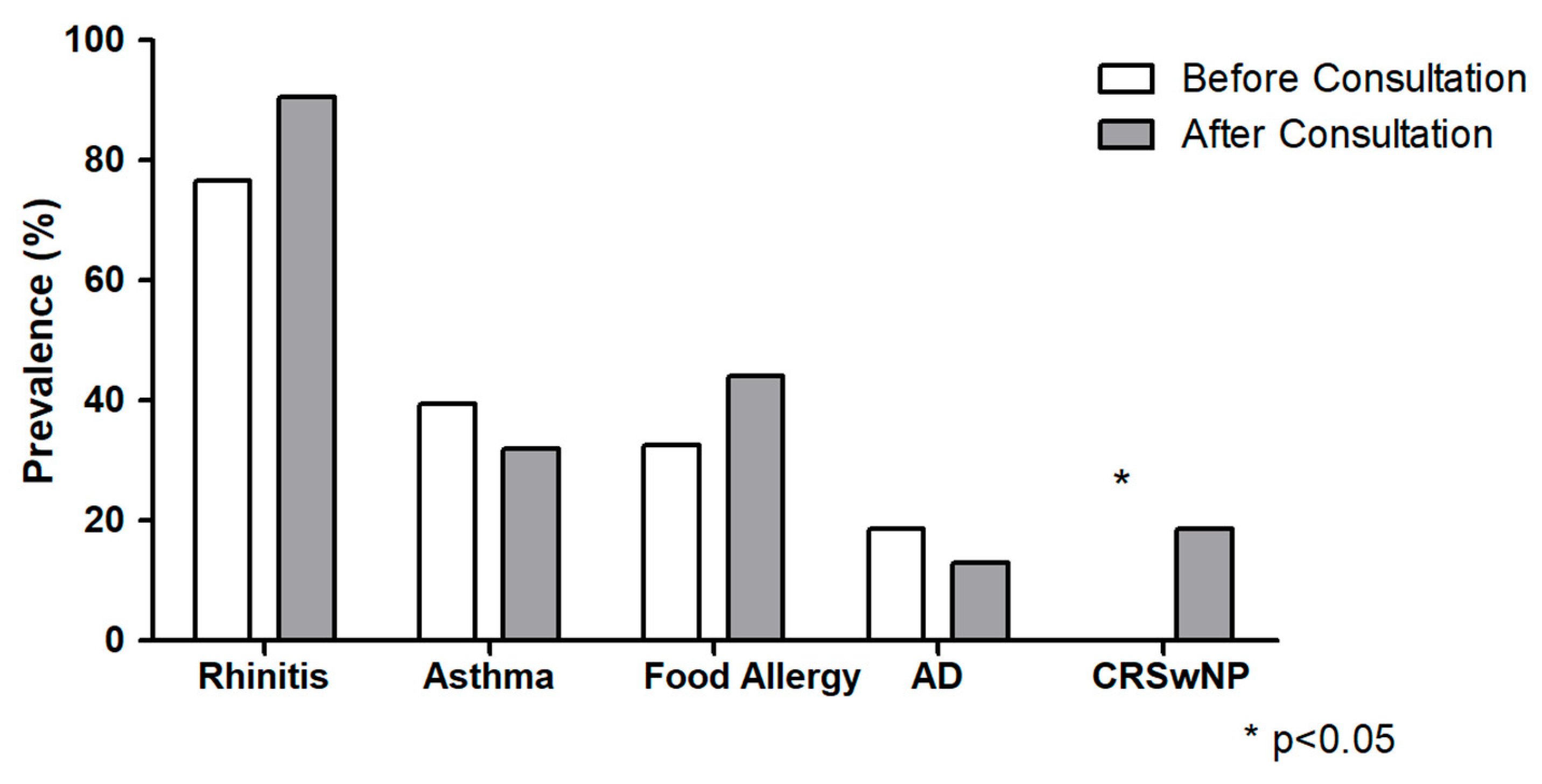Specialist consultations led to the identification of T2 comorbidities in 41 patients (95.3%), with three additional patients diagnosed with previously unreported T2 diseases. Although not statistically significant, a slight increase in IgE-mediated food allergy prevalence (32.5% to 44.1%) was observed. Conversely, asthma prevalence decreased (39.5% to 32%) due to spirometry-based exclusion of three patients. Similarly, AD prevalence declined (18.6% to 13%) after one patient was reclassified with dermographic urticaria (all p = ns). In contrast, after ENT evaluations, we observed a significant increase in CRSwNP prevalence (0% to 18.6%, p = 0.01), since nearly 20% of the overall population complained of chronic symptoms of nasal obstruction but were unaware of the diagnosis of CRSwNP. We also noted a general rise in rhinitis prevalence (76.5% to 90.6%, p = ns), though not statistically significant.