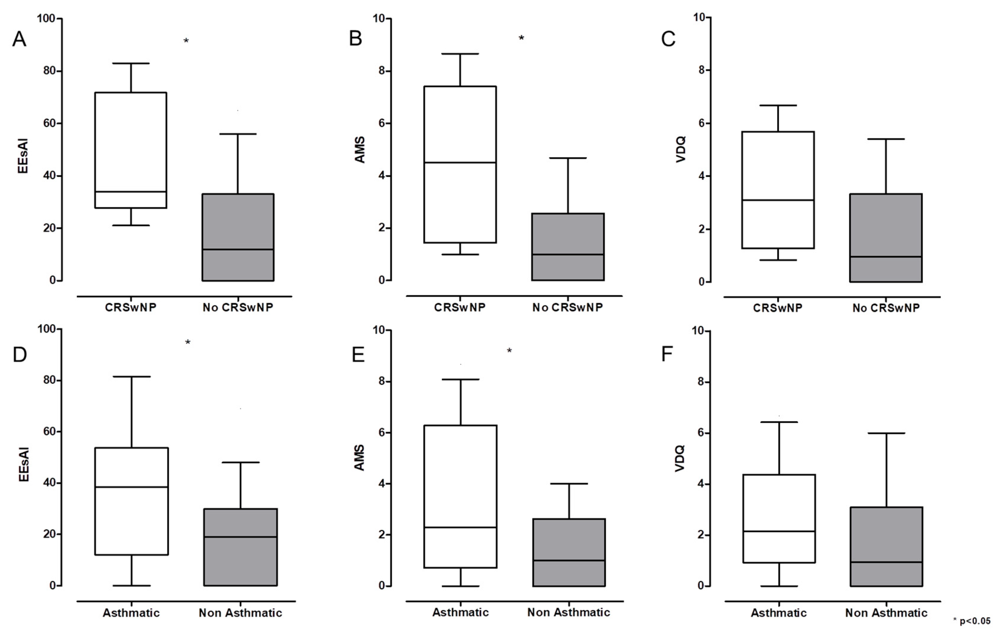 Accordingly, patients with asthma had significantly higher total EEsAI [38.5 (14.25–49.75) vs. 19 (0–27); p < 0.05] and AMS scores [2.29 (0.86–6) vs. 1 (0–2.57); p < 0.05], while VDQ did not significantly differ [2.15 (0.99–4.17) (95% CI, 1.52–4.08) vs. 0.95 (0–2.86) (95% CI, 1.02–2.83); p = ns]. No differences were observed in age [29 (22.25–35.5) (95% CI, 23.97–37.18) vs. 25 (21–32) (95% CI, 25.31–35.09) years], age of onset [15.5 (8.75–33.5) (95% CI, 13.21–30.03) vs. 18 (10–25) (95% CI, 15.59–27.30) years], diagnostic delay [6.5 (2.5–14.25) (95% CI, 4.39–12.60) vs. 7 (3–12) (95% CI, 5.86–11.65) years], EREFS scores [3 (2–4) (95% CI, 2.07–3.93) vs. 2 (1–3) (95% CI, 2.01–2.96)], stricture prevalence (28.6% vs. 10.3%), food impaction history (21.4% vs. 51.7%) or GERDQ score [7 (6.25–9.5) (95% CI, 6.34–9.06) vs. 9 (7–12) (95% CI, 8.34–10.52); all p = ns]. No significant differences were observed for all the other T2 comorbidities analyzed. The symptoms score of comorbid patients with CRSwNP and asthma are depicted in Figure 2.
