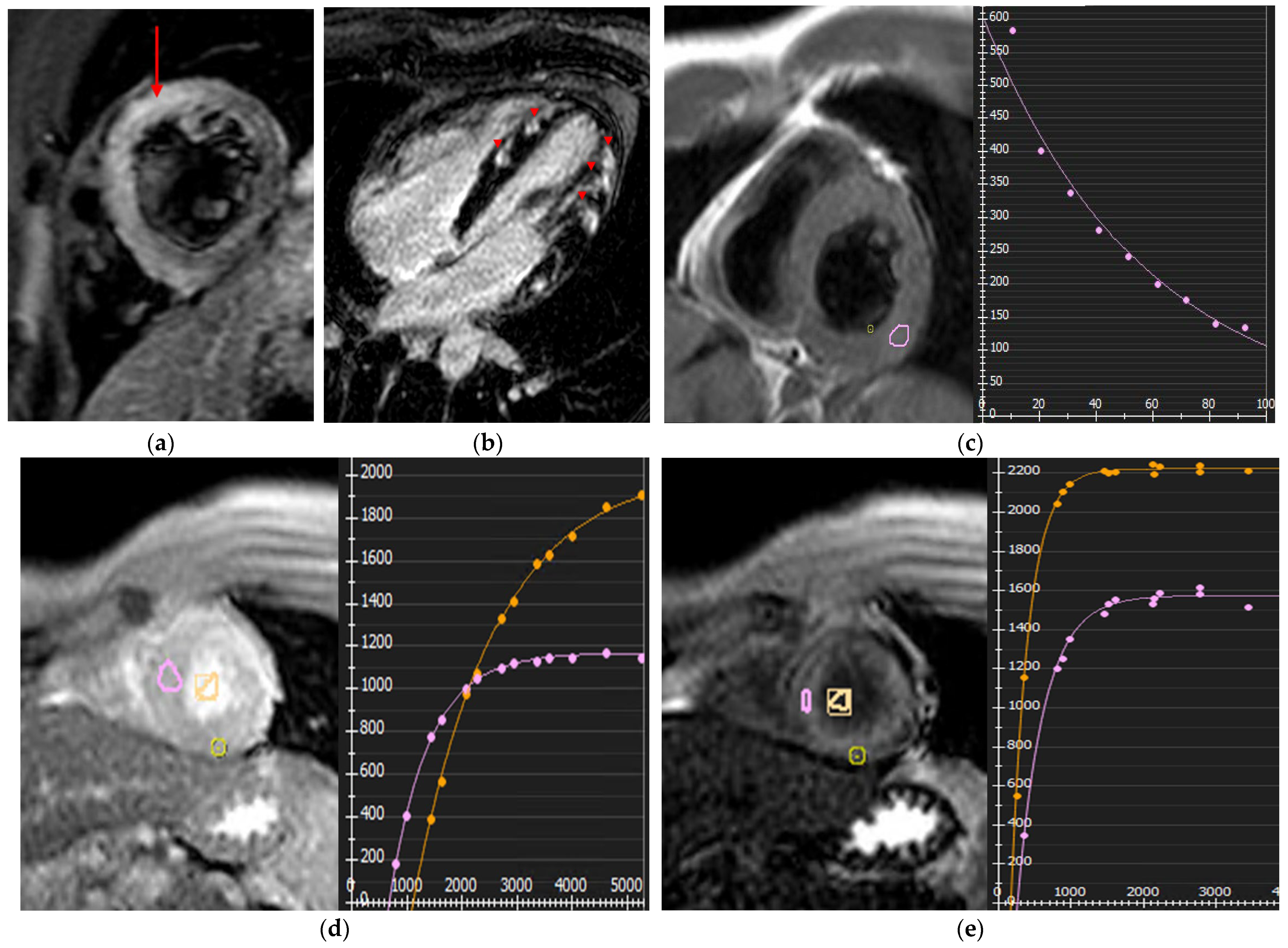 - Messroghli, D.R.; Moon, J.C.; Ferreira, V.M.; Grosse-Wortmann, L.; He, T.; Kellman, P.; Mascherbauer, J.; Nezafat, R.; Salerno, M.; Schelbert, E.B.; et al. Clinical recommendations for cardiovascular magnetic resonance mapping of T1, T2, T2* and extracellular volume: A consensus statement by the Society for Cardiovascular Magnetic Resonance (SCMR) endorsed by the European Association for Cardiovascular Imaging (EACVI). J. Cardiovasc. Magn. Reson. 2017, 19, 75. [Google Scholar]