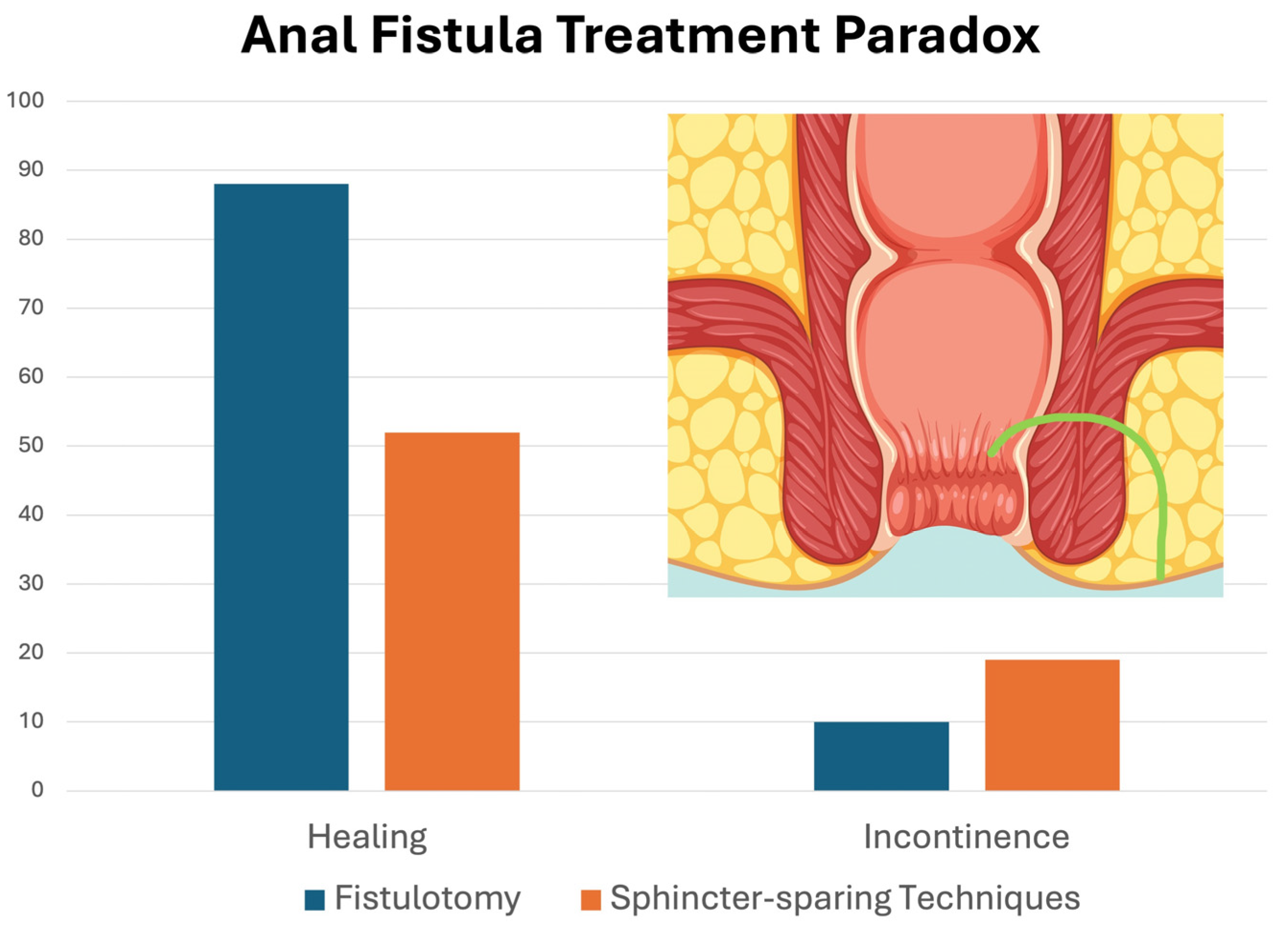 - Bhat, S.; Xu, W.; Varghese, C.; Dubey, N.; Wells, C.I.; Harmston, C.; O’gRady, G.; Bissett, I.P.; Lin, A.Y. Efficacy of different surgical treatments for management of anal fistula: A network meta-analysis. Tech. Coloproctol. 2023, 27, 827–845. [Google Scholar] [CrossRef] [PubMed]