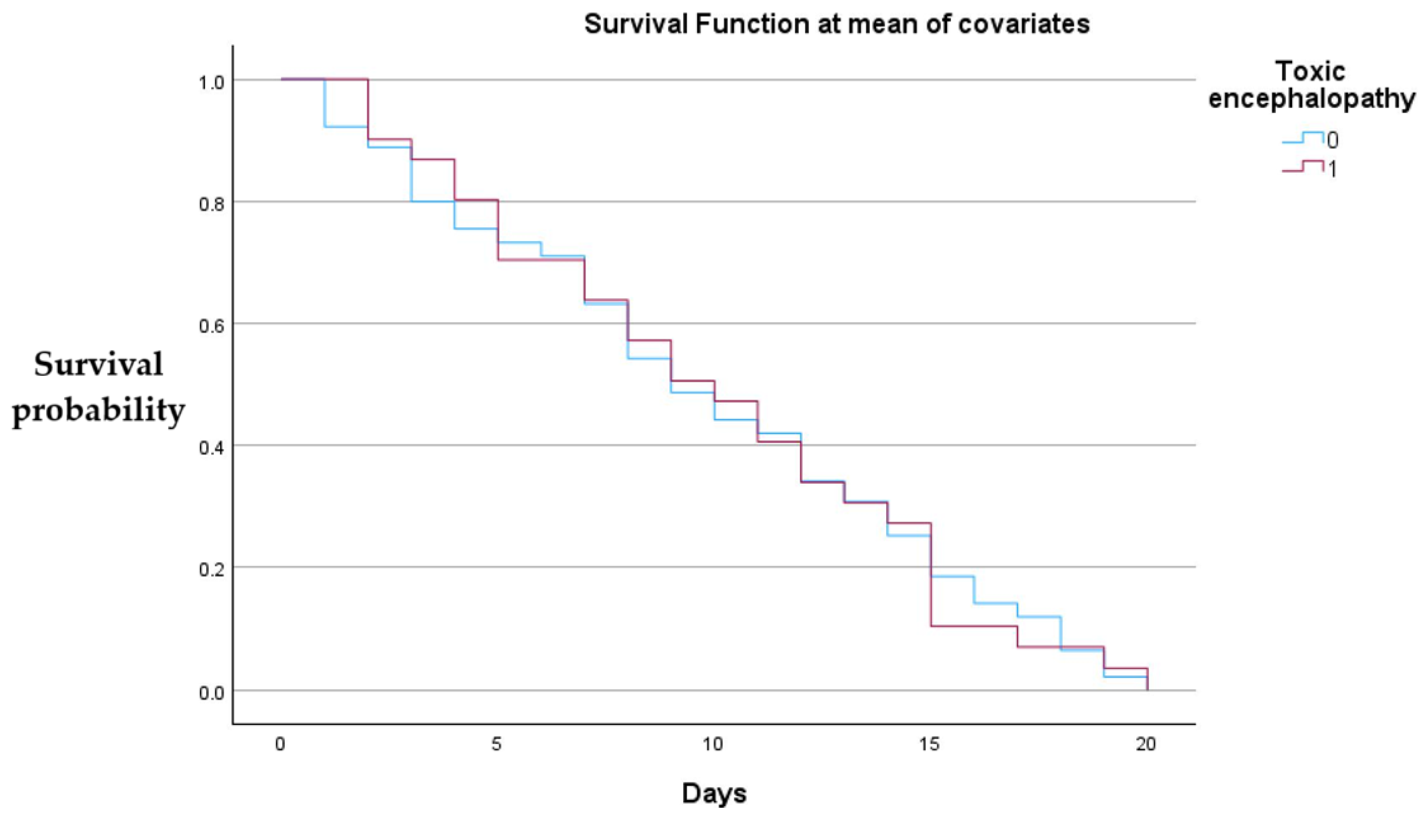 Both groups demonstrate a gradual decline in survival over the 20-day observation period, with no evident large divergence between the curves, suggesting that toxic encephalopathy status did not produce a substantial difference in short-term survival when other covariates were held constant.