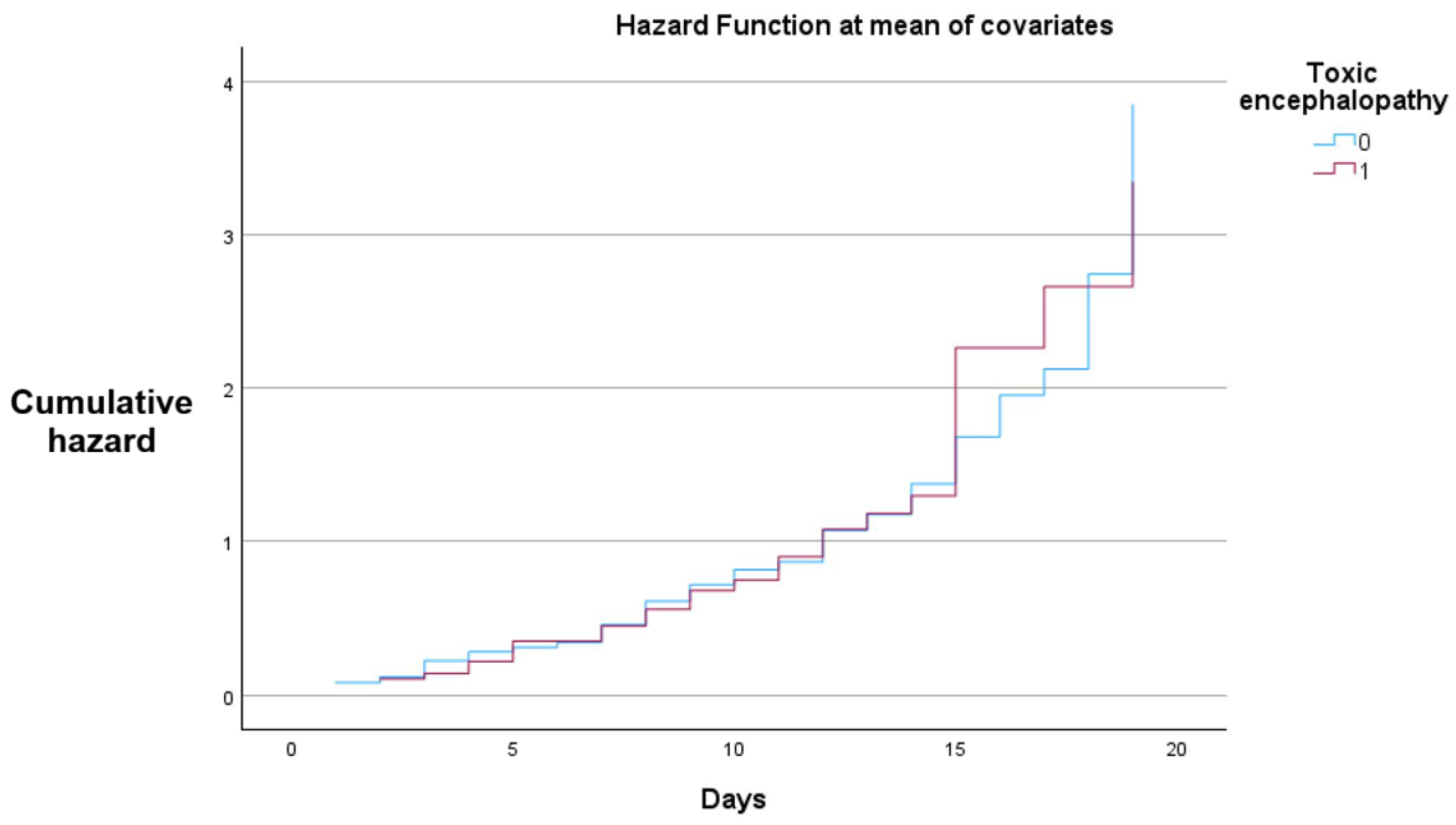 Figure 4 demonstrates a higher cumulative hazard for the patients with toxic encephalopathy.