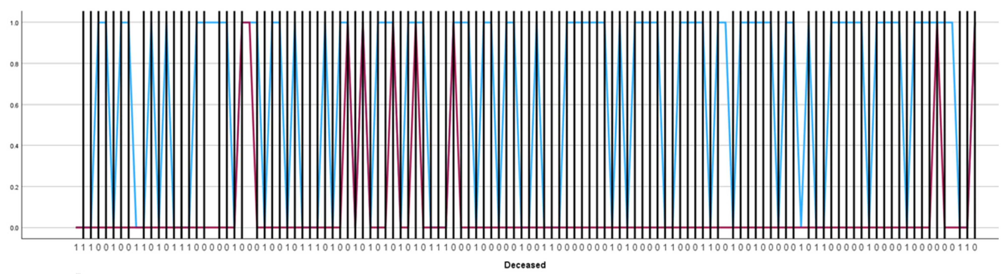 Figure 5 displays the binary distribution of lactulose (blue) and rifaximin (red) administration among the 120 patients in the study cohort, stratified by mortality status (Deceased = 1, Survived = 0). Each vertical bar represents an individual patient, with the y-axis indicating the presence (1) or absence (0) of each medication. The x-axis is ordered by patient mortality, allowing direct visual comparison between survivors and non-survivors.