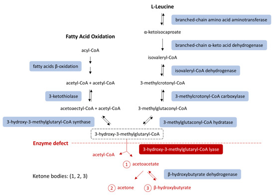 Ketone body synthesis from fatty acid β-oxidation and leucine catabolism. HMG-CoA lyase deficiency (red) blocks conversion of HMG-CoA into acetoacetate, impairing ketogenesis. An HMG-CoA lyase deficiency (red) impairs ketogenesis [8,9]. Modified from [8], licensed under CC BY 3.0 (https://creativecommons.org/licenses/by/3.0/ (accessed on 14 October 2025)). Abbreviations: HMG-CoA, 3-hydroxy-3-methylglutaryl-coenzyme A.