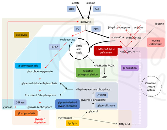 Disrupted metabolism in HMG-CoA lyase deficiency. Impaired β-oxidation and leucine catabolism prevent acetyl-CoA production, inhibiting gluconeogenesis (via PC) and enhancing glycolysis (via PDH), leading to energy failure during starvation, diverting pyruvate toward the citric acid cycle and limiting its availability for gluconeogenesis. Solid arrows = single-step processes; dashed arrows = simplified multi-step processes; Red arrows = reduced activity; Red cross = blocked pathways; Bold arrows = increased activity. A stylized mitochondrion highlights the intra-mitochondrial pathways. Modified from [17], licensed under CC BY 3.0 (https://creativecommons.org/licenses/by/3.0/). Abbreviations: LDH: lactate dehydrogenase, ALT: alanine aminotransferase, PC: pyruvate carboxylase, PDH: pyruvate dehydrogenase, PEPCK: phosphoenolpyruvate carboxykinase, G6Pase: glucose-6-phosphatase, G3PDH: glyceraldehyde-3-phosphate dehydrogenase, HMG-CoA: 3-hydroxy-3-methylglutaryl coenzyme A, NADH: nicotinamide-adenine dinucleotide, FADH2: flavin adenine dinucleotide [4,8,9,17].