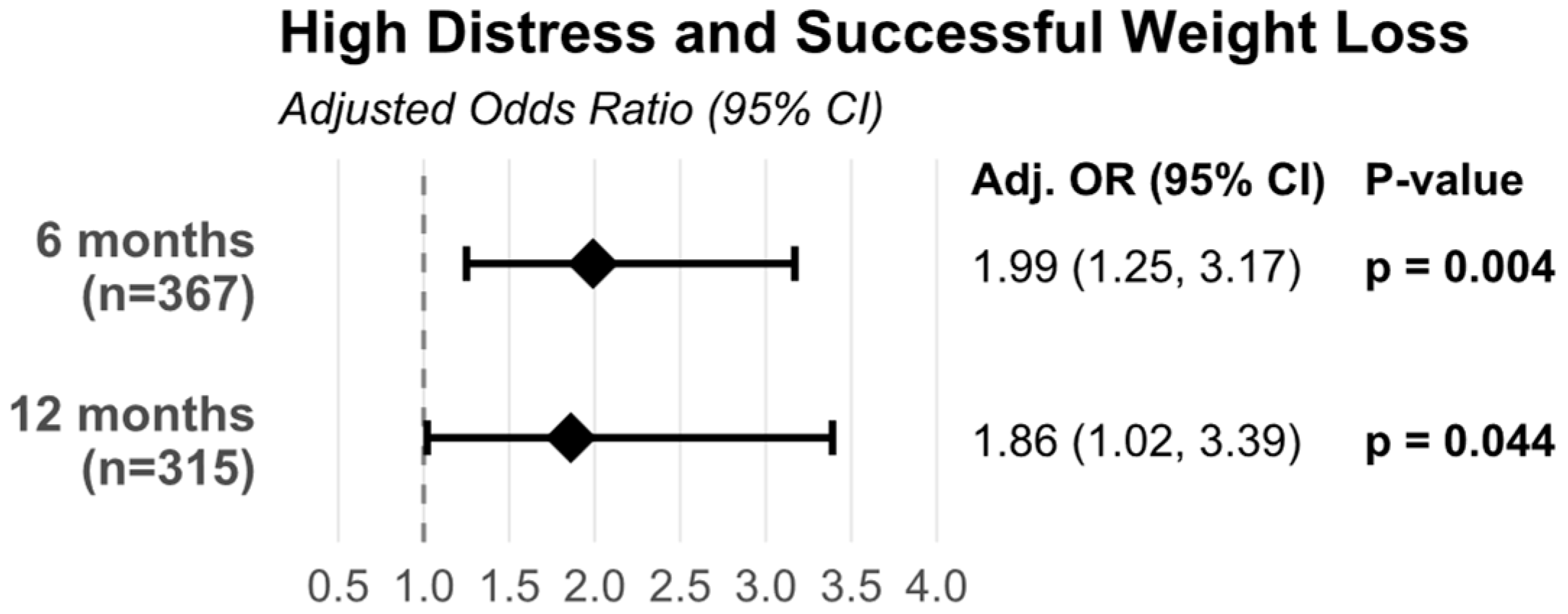 At 6 months post-surgery, the adjusted odds ratio was 1.99 (95% CI: 1.25–3.17, p = 0.004), indicating that patients with high psychological distress were approximately twice as likely to achieve successful weight loss. This association persisted at 12 months, with an adjusted odds ratio of 1.86 (95% CI: 1.02–3.39, p = 0.044), demonstrating that the relationship between preoperative psychological distress and weight loss success remained significant throughout the first postoperative year.