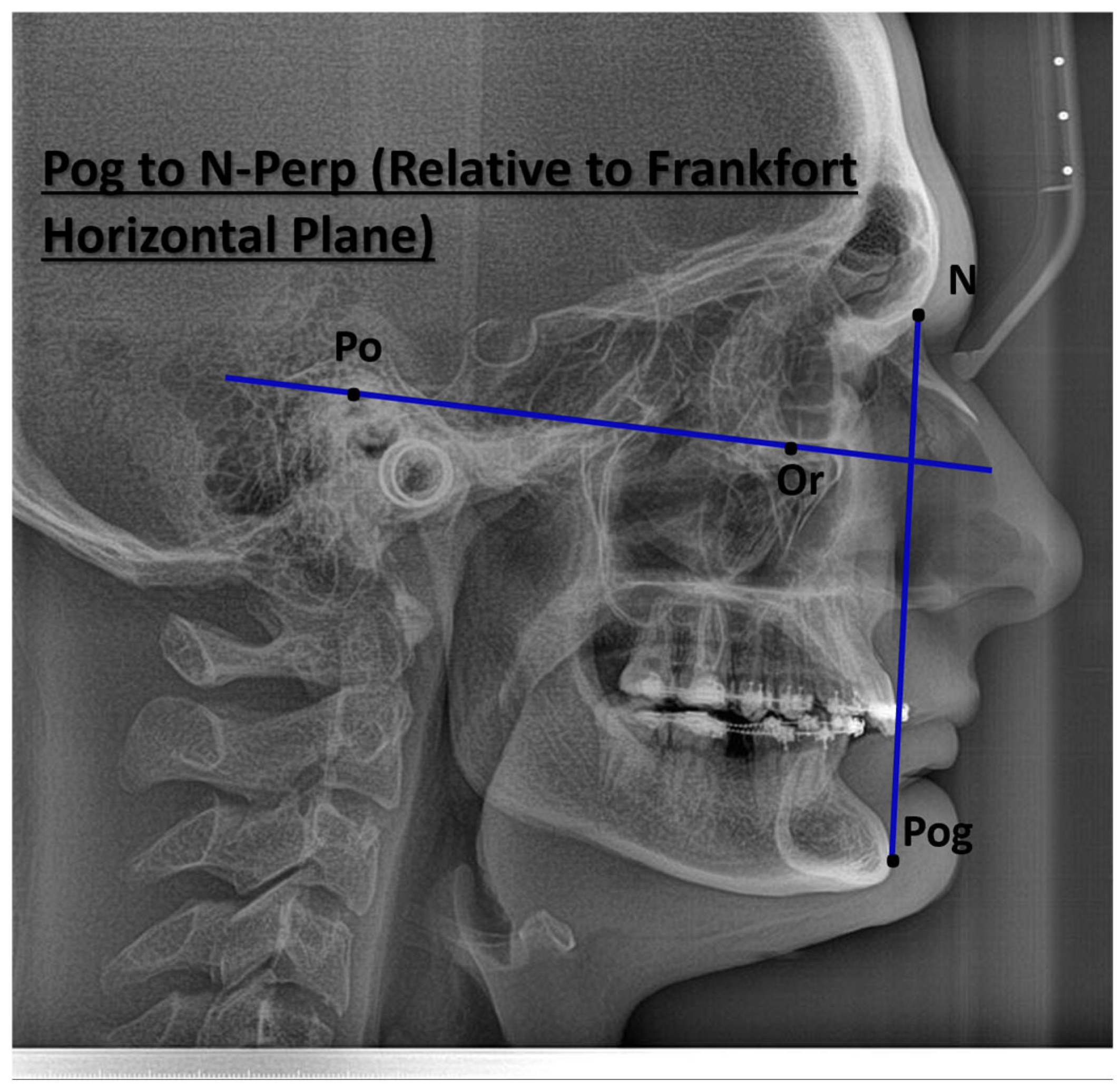 | Pogonion to N-Perpendicular FH (mm) | 1.87 (−0.94, 2.31) | 1.4 (0.4, 2.6) |