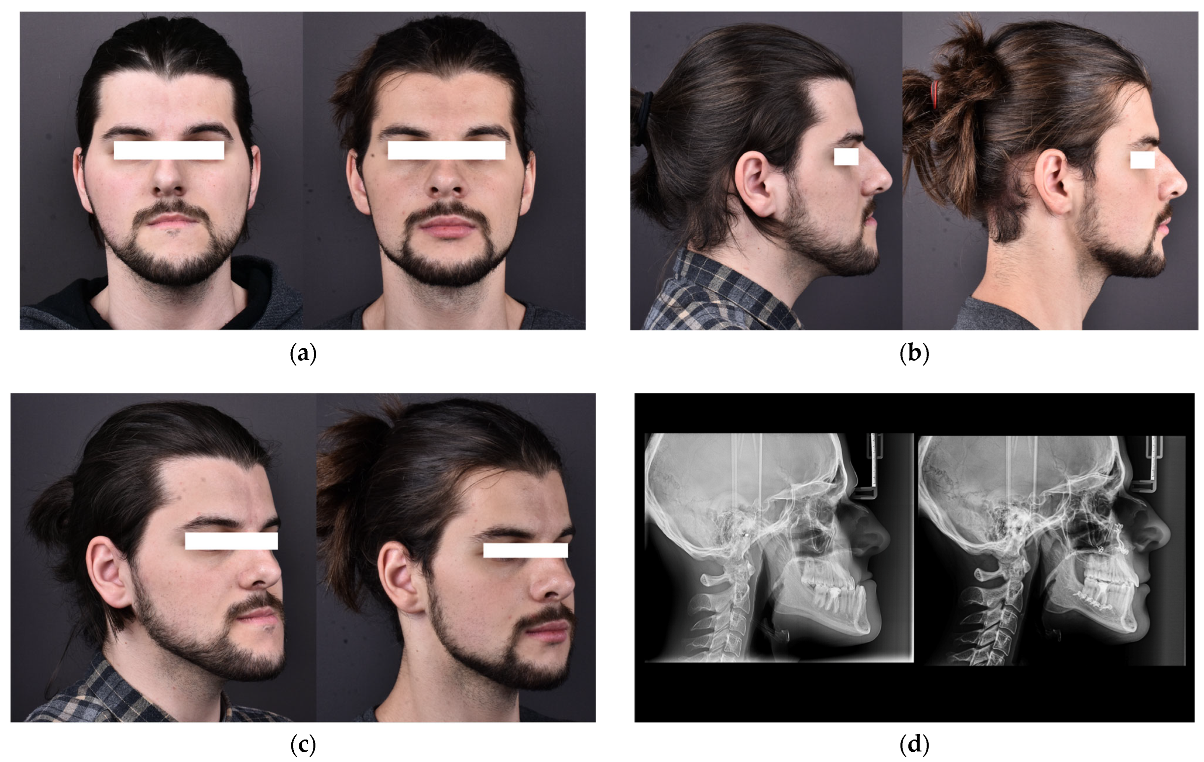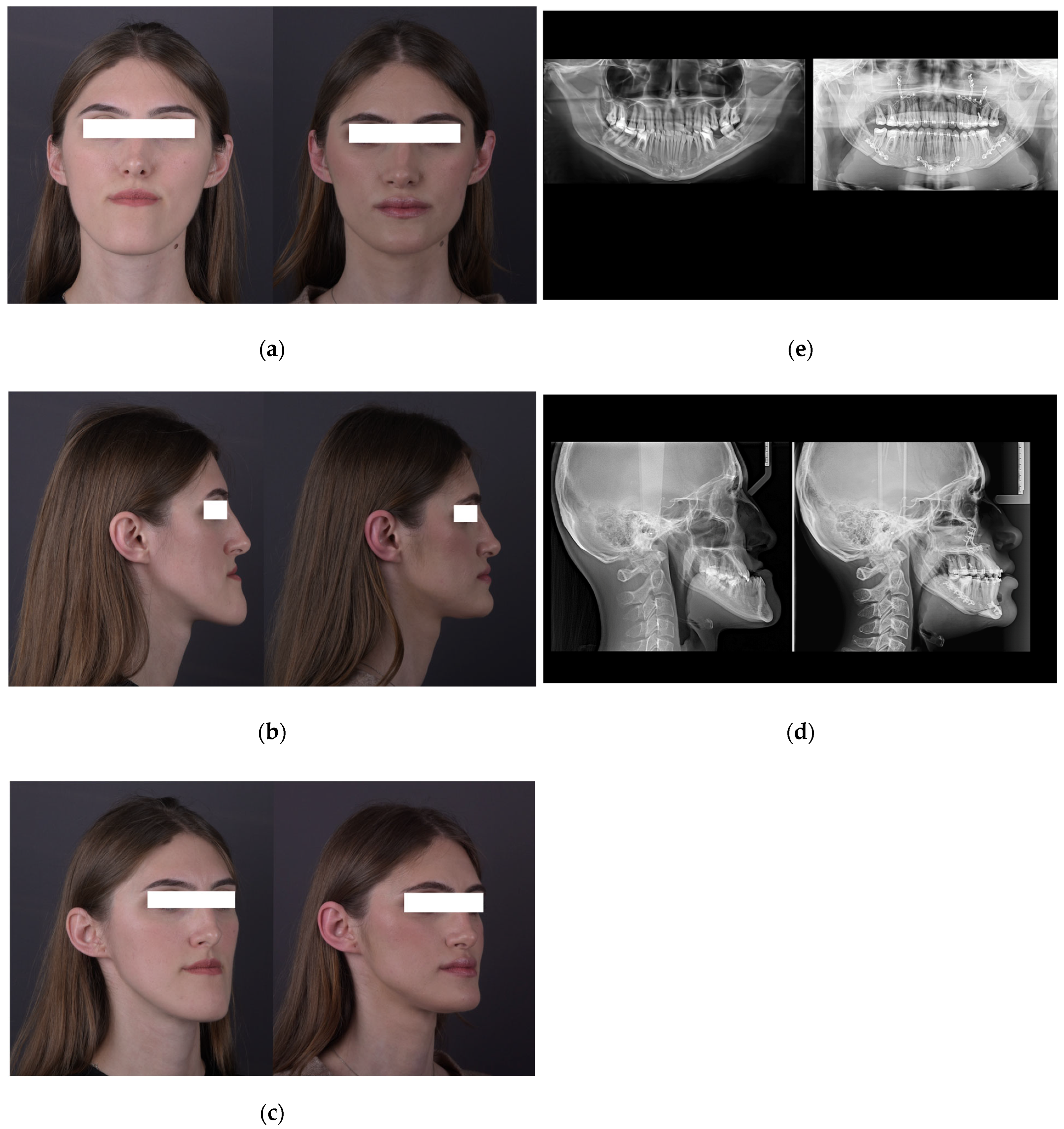 - Psomiadis, S.; Sifakakis, I.; Iatrou, I.; Gkantidis, N. Aesthetic Impact of Orthognathic Surgery vs. Orthodontic Camouflage in Class II Division 1 Patients with Convex Facial Profile: A Follow-Up Using Combined Frontal and Profile Views. J. Clin. Med. 2025, 14, 4277. [Google Scholar] [CrossRef] [PubMed]