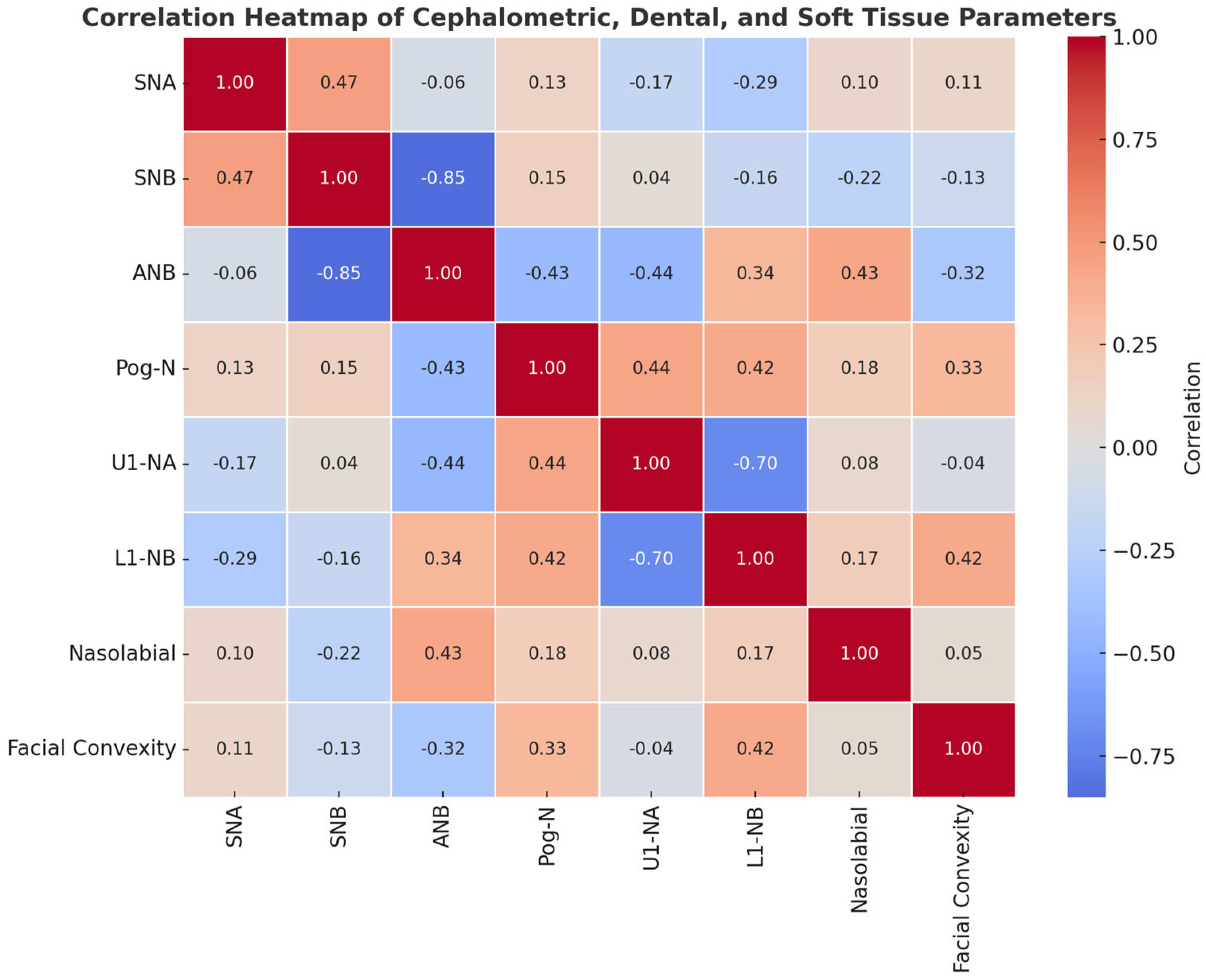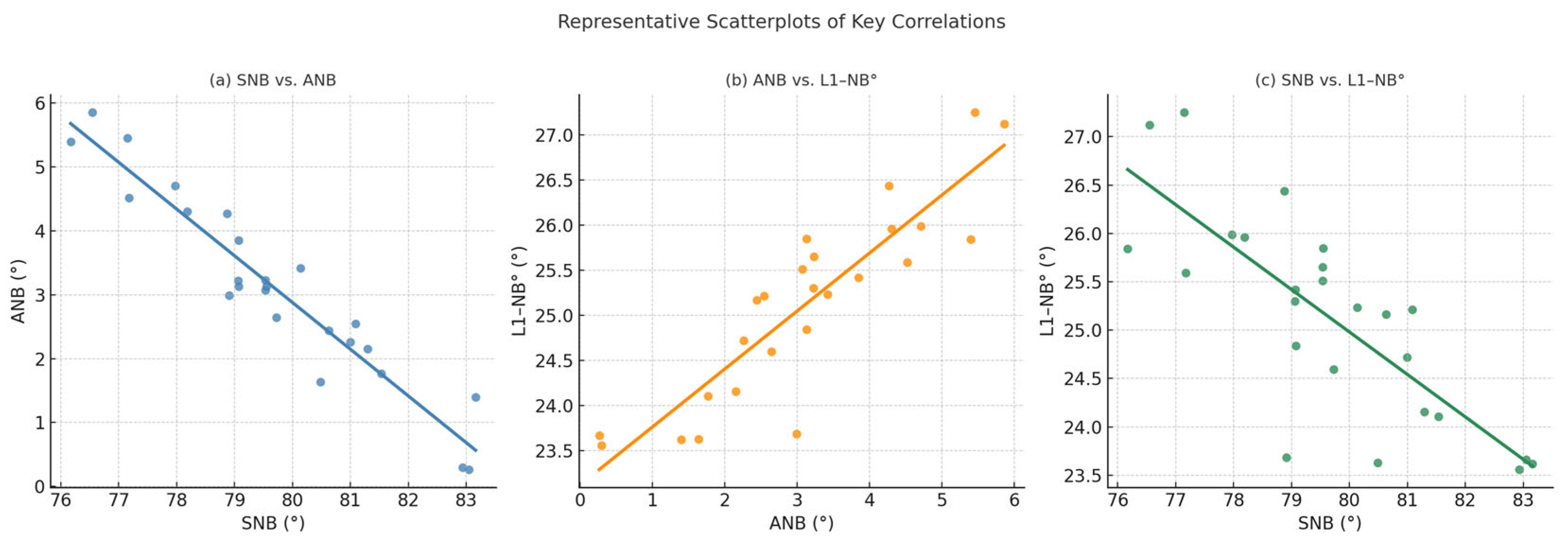 | ANB | 0.099 (−0.308, 0.476), p = 0.637 | 0.058 (−0.345, 0.443), p = 0.784 | −0.852 (−0.933, −0.689), p < 0.001 | ||||||