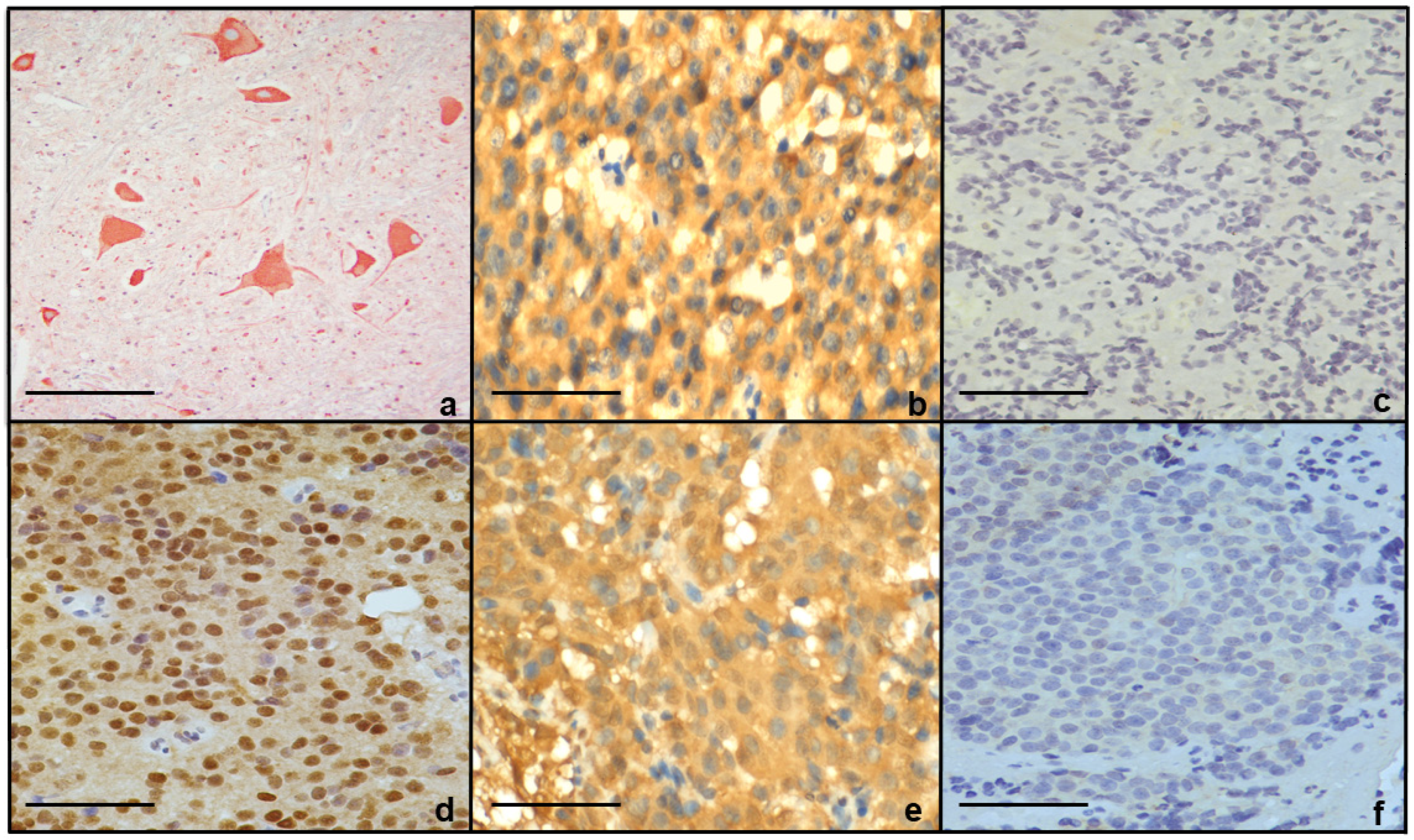Figure 1. D2R and Erα receptor IHC of (a) D2R staining neurons positive in normal spinal cord (200X); (b) 28-year-old male (non-resistant) with tumor cells positive for D2R (400X); (c) 34-year-old male (resistant) with tumor cells negative for D2R (400X); (d) 31-year-old female (non-resistant) with tumor cells positive for ER (400X); and (e,f) 11-year-old pre-pubertal girl with a resistant tumor whose tumor cells were positive for D2R and negative for Erα ((e) 400X, (f) 400X)). Scale bar, 50 μm.