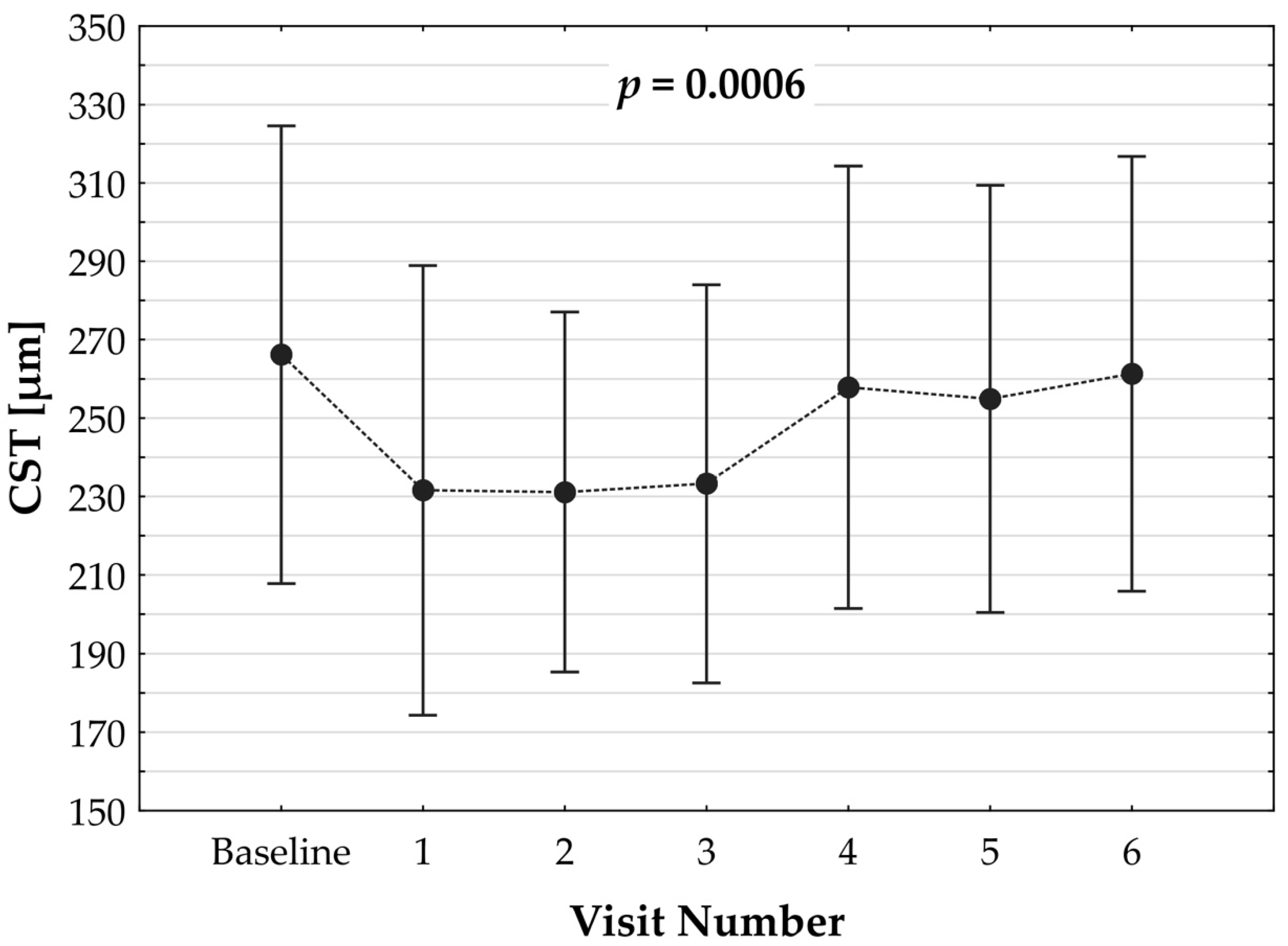 3.2. Central Subfoveal Retinal Thickness (CST)