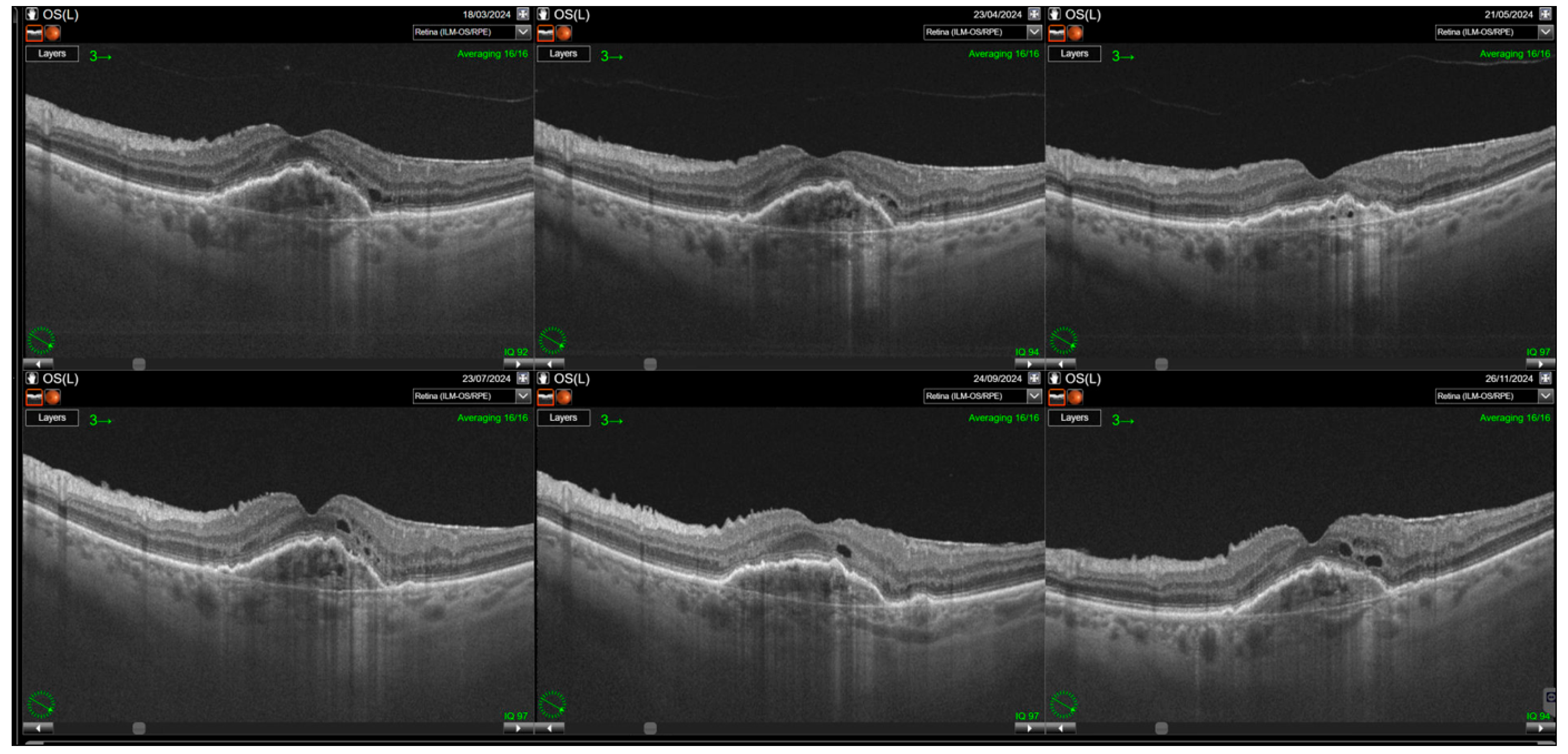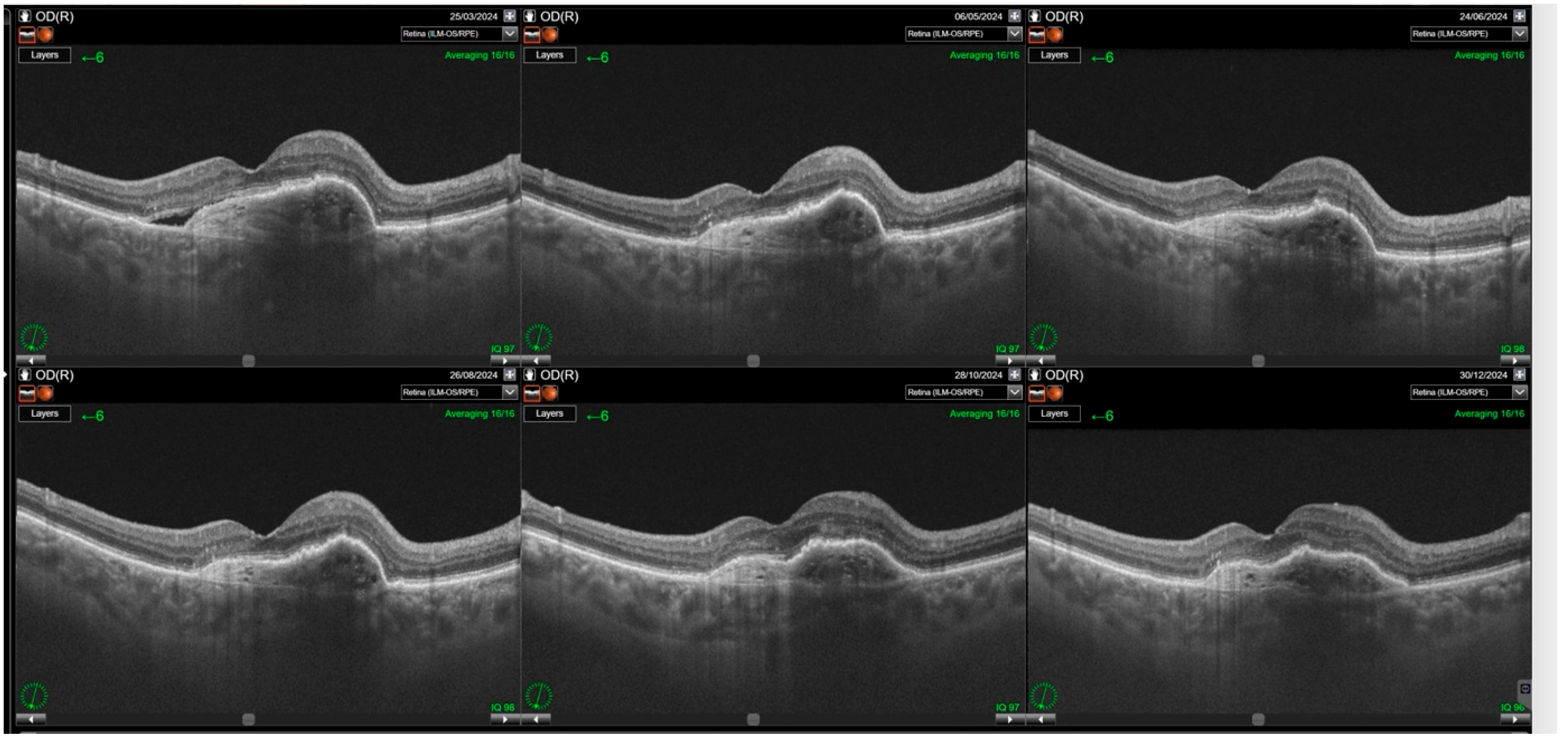 - Persistent subretinal fluid (SRF), intraretinal fluid (IRF), or pigment epithelial detachment (PED).