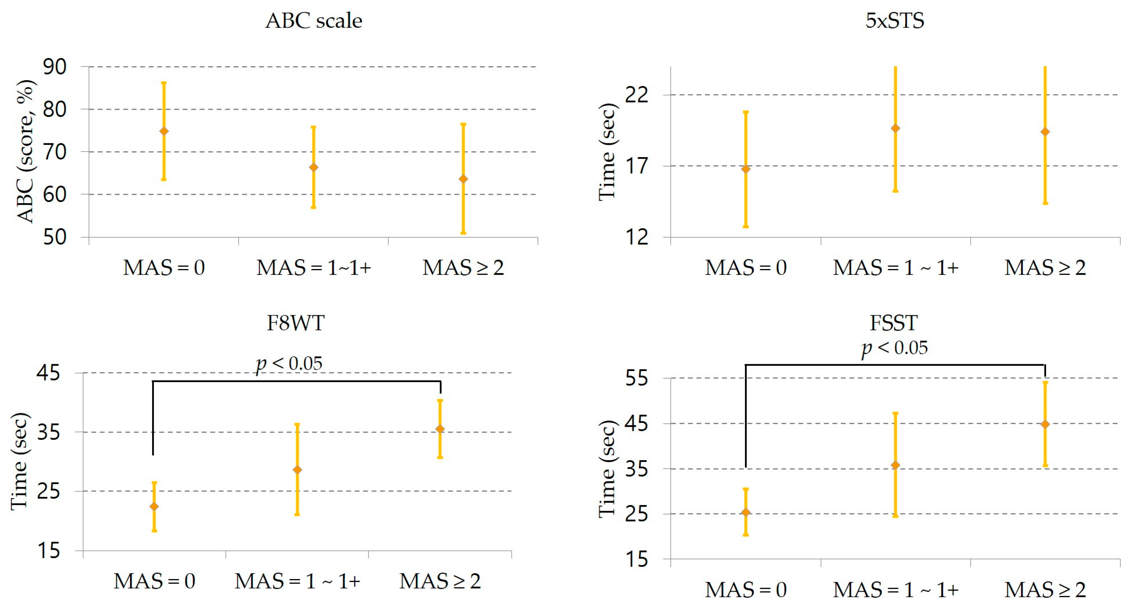 Previous research has shown that assessment outcomes and corresponding MDC values in tools such as the Berg Balance Scale, Fugl-Meyer Assessment, Timed Up and Go Test (TUG), and 10-Meter Walk Test vary according to the degree of ankle plantar flexor spasticity [23]. These results suggest that reducing ankle spasticity may contribute to improvements in balance, motor control, and gait function [24,25]. Nevertheless, limited evidence is available regarding differences in performance on the ABC Scale, 5xSTS, F8WT, and FSST based on the severity of ankle plantar flexor spasticity in chronic stroke patients.
