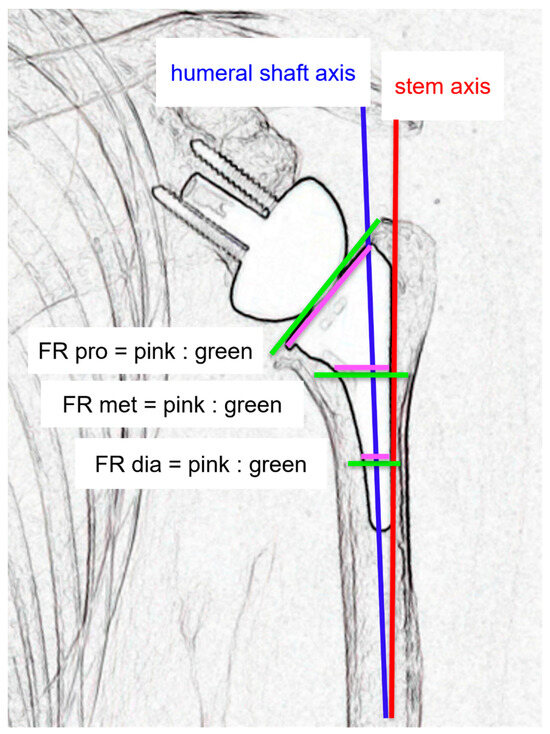 Radiographic measurements. Stem alignment was measured as the angle between the humeral axis (blue line) and the stem axis (red line). Canal filling ratio was calculated at three levels: (1) proximally (filling ratio pro, at the osteotomy site); (2) at the metaphysis (filling ratio met, at a line perpendicular to the humeral axis from the stem’s medial inflection point); and (3) at the diaphysis (filling ratio dia, at a line perpendicular to the humeral axis at the distal third of the stem). At each level, the quotient between the pink and the green line is the filling ratio.