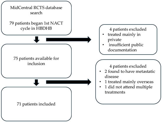 Between 1 January 2019 and 31 January 2025, a total of 79 patients commenced NACT treatment in HB (Figure 1). Four patients were treated mainly privately and due to insufficient public documentation available they could not be included. A further four patients were subsequently excluded from final analysis: two were found to have metastatic disease on delayed staging scans, one received the majority of their treatment overseas and the available documentation was inadequate and one did not attend NACT treatments and developed metastatic disease. Ten of the included patients also received additional neoadjuvant HER2+ therapy or immunotherapy privately.