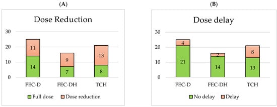 ‘Dose reductions’ included reduced doses of chemotherapy drugs, stopping drug components for the next cycle (e.g., stopping carboplatin but continuing docetaxel in FEC-DC) and not escalating treatment to maximum dosing due to toxicity (e.g., in FEC-D and FEC-DH, where standard practice is to begin docetaxel at 75 mg/m2 and then increase to 100 mg/m2 for cycles 5 and 6 if well tolerated). ‘Treatment delay’ was a delay in treatment for at least one week and ‘early cessation’ was recorded for anyone who did not complete the total number of planned treatment cycles.
