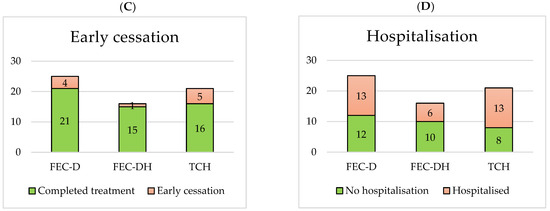 Number of dose reductions (A), dose delays (B), early cessations (C) and hospitalisations (D) per NACT treatment base.