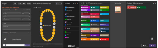 In the first stage, the patient’s file was completed in Dental DB (patient database, Figure 2A), where both arches with existing healthy teeth were selected as “Healthy” (Figure 2B), so that the software would not propose design steps in Dental CAD, but would only allow the import of the two antagonist arches in occlusion.