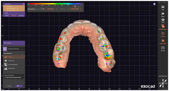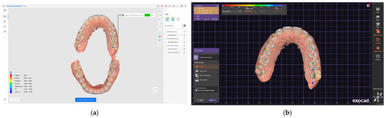 Therefore, for the present study, the surfaces from blue to red are considered for the Medit software, and for the Exocad software, the colors from magenta to green are used (Figure 4a,b).