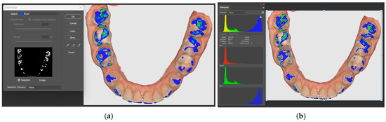 After selection, it was possible to evaluate the histogram separately for each image (Figure 5a,b), collecting in the central table the number of pixels corresponding to the total surface of the colors in the contact areas, for the position of MICP, EEPP, EERLP and EELLP for each subject.