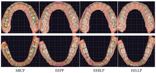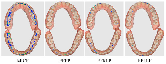 Aspects of Medit i700 recordings for MICP, EEPP, EERLP, EELP (the color scale features blue, cyan, green, yellow, and red, where blue signifies a reduced contact and red a close contact (collision, interpenetration)).