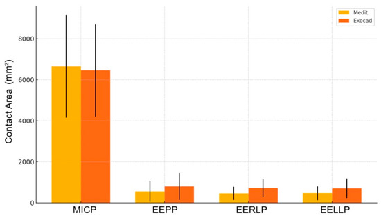 Comparative analysis of contact area measurements (MEDIT vs. EXOCAD). Maxillary average contact area plotted with error bars corresponding to SD.