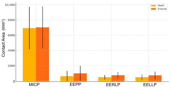 Comparative analysis of maxillary and mandibular contact areas for EEPP in EXOCAD vs. MEDIT.