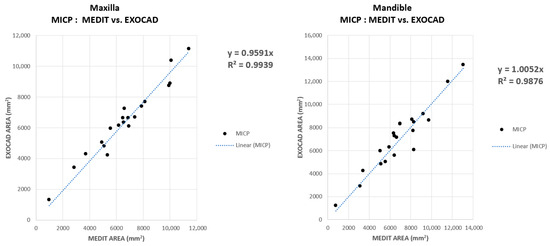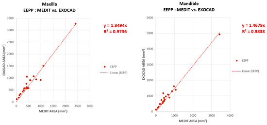 A high, super-unitary value of the slope can be observed in both the maxilla (1.34) and mandible (1.46) graphical representations, these results indicating an overestimation of the contact surface values for EEPP in Exocad. In other words, the values on the ordinate (contact area in Exocad) are higher than the values on the abscissa (contact area in Medit).