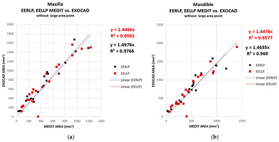 Comparison of the contact area measurements obtained using EXOCAD and MEDIT for the EERLP and EELLP. Plotted data—maxilla (a); mandible (b).