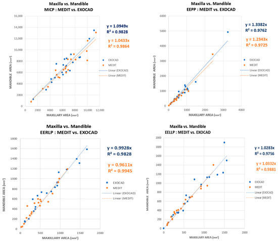 Another data analysis performed in this study was to compare the contact areas obtained for the mandible (ordinate) with the contact areas obtained for the maxilla (abscissa). The results obtained for both software are shown in the graphic representation. In Figure 13 it is observed that the slopes of the linear regressions are close to unity for the MICP, EERLP and EELLP, but for the position of EEP the contact areas are overestimated for those associated with the mandible. This overestimation is valid in both Exocad and Medit.