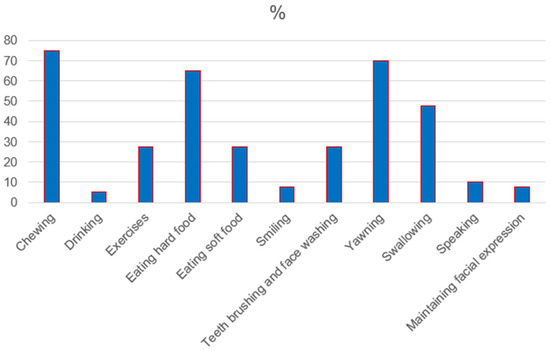 Healthy participants reported no jaw function limitations contrary to RA patients (p ˂ 0.05). In the RA group, difficulty chewing, yawning, eating hard food, and swallowing were reported most often in 75%, 70%, 65%, and 45%, respectively. The detailed distribution of jaw function limitations in the RA group is presented in Figure 1.