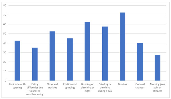 There was a statistically significant difference in TMD between RA and HS groups (p ˂ 0.05). There were no TMDs in the HS group. The most frequent TMDs reported in the RA group were tinnitus and teeth grinding and clenching at night as well as during the day, followed by jaw clicks and crackles. A relatively large group of RA patients reported limited mouth opening and TMJ sounds such as friction and grinding. The detailed distribution of TMD reported in the RA group is presented in Figure 2.