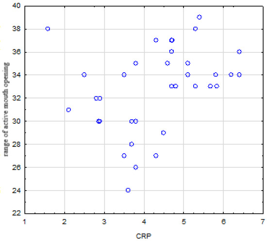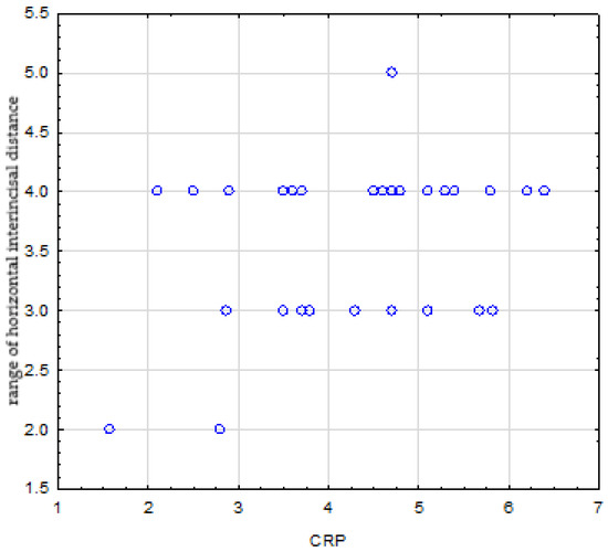 There was no relationship between disease duration, ESR and CRP levels, and the range of maximum passive mouth opening, which were (p = 0.524), (p = 0.825), and (p = 0.235), respectively. There were no correlations between disease duration, ESR level, and horizontal inter-incisal distance, which were (p = 0.282) and (p = 0.319), respectively. In turn, there was a statistically significant positive correlation between horizontal inter-incisal distance and CRP level (r = 0.355, p = 0.024) (Figure 4).