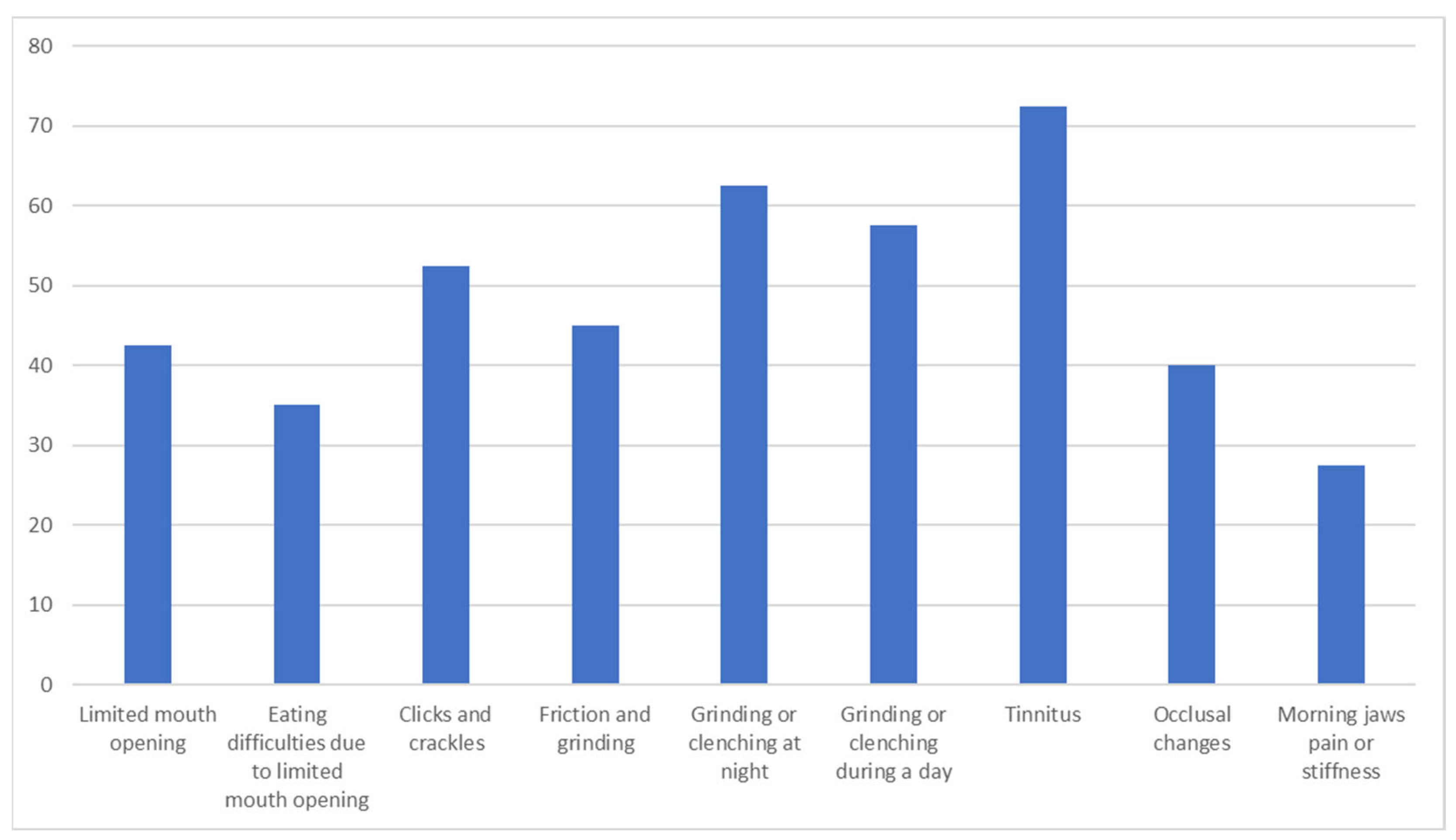 - Sadura-Sieklucka, T.; Gębicki, J.; Sokołowska, B.; Markowski, P.; Tarnacka, B. Temporomandibular joint disorders in patients with rheumatoid arthritis. Reumatologia 2021, 59, 161–168. [Google Scholar] [CrossRef]
