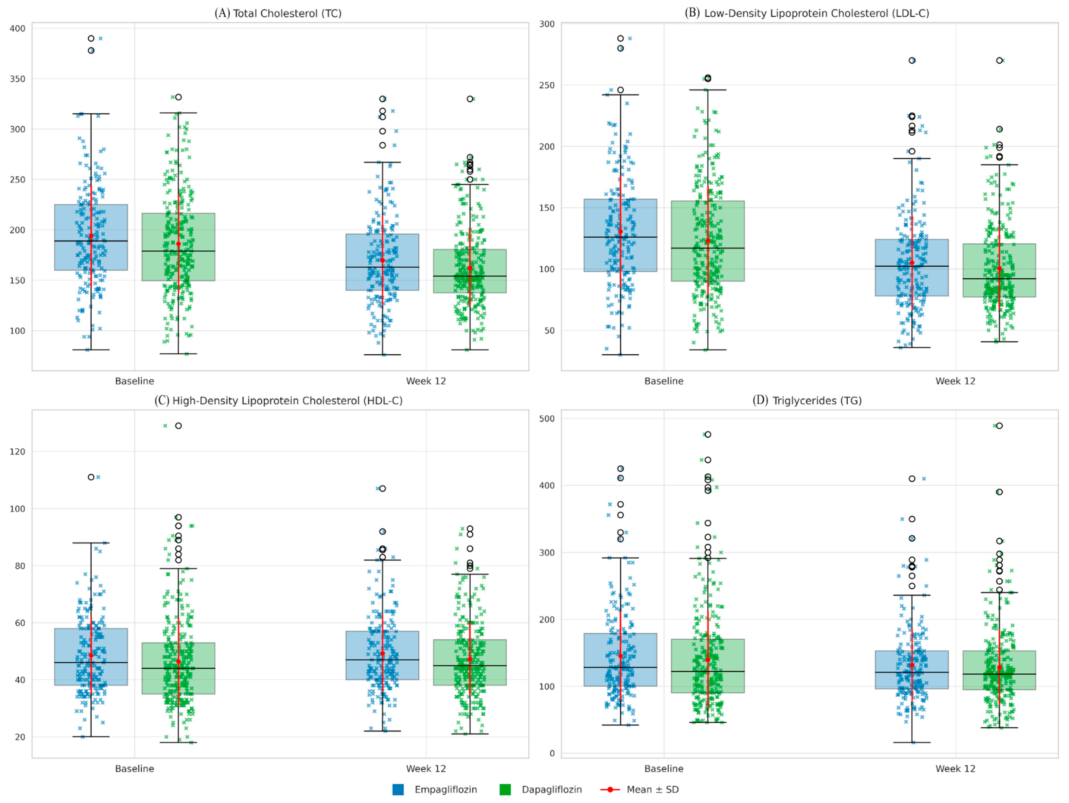 - TG: In the empagliflozin group, the proportion of patients with TG < 150 mg/dL increased from 63.7% to 71.1%, while those with 150–499 mg/dL decreased from 36.3% to 28.9% (p = 0.029). In the dapagliflozin group, the proportion of patients with TG < 150 mg/dL increased from 66.4% to 73.5%, while the proportion with 150–499 mg/dL decreased from 33.6% to 26.5% (p = 0.009). No patients in either group had TG > 500 mg/dL.