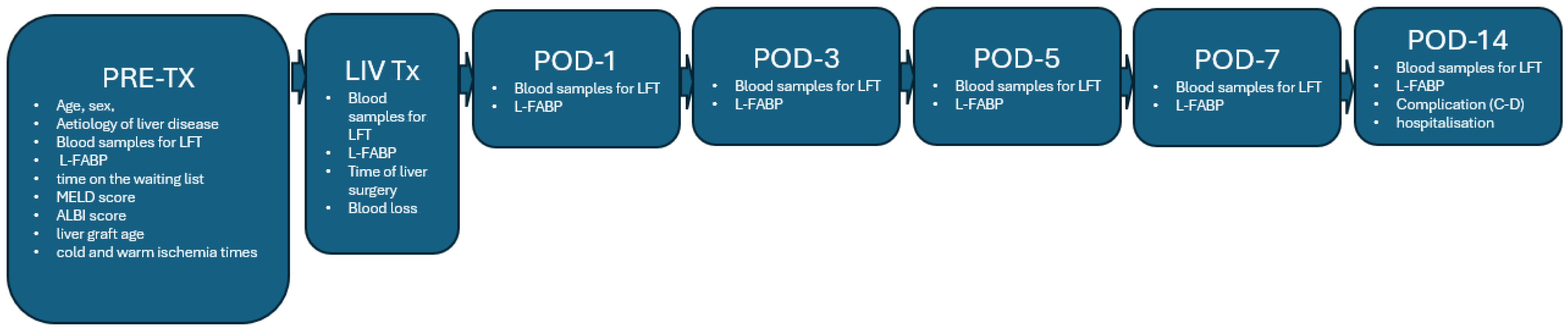 - Monbaliu, D.; de Vries, B.; Crabbé, T.; van Heurn, E.; Verwaest, C.; Roskams, T.; Fevery, J.; Pirenne, J.; Buurman, W. Liver fatty acid-binding protein: An early and sensitive plasma marker of hepatocellular damage and a reliable predictor of graft viability after liver transplantation from non heart-beating donors. Transplant. Proc. 2005, 37, 413–416. [Google Scholar] [CrossRef]