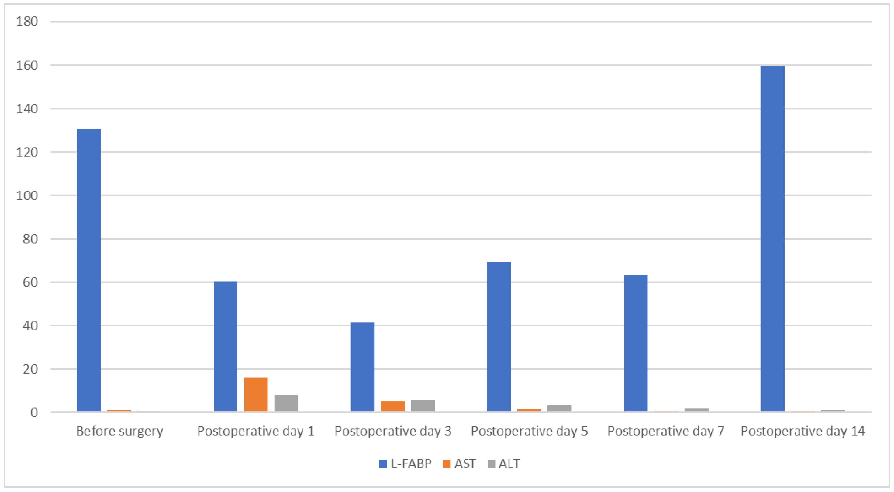 Postoperative hemorrhage | Statistically significantly lower values for L-FABP on PODs 5 and 7 |