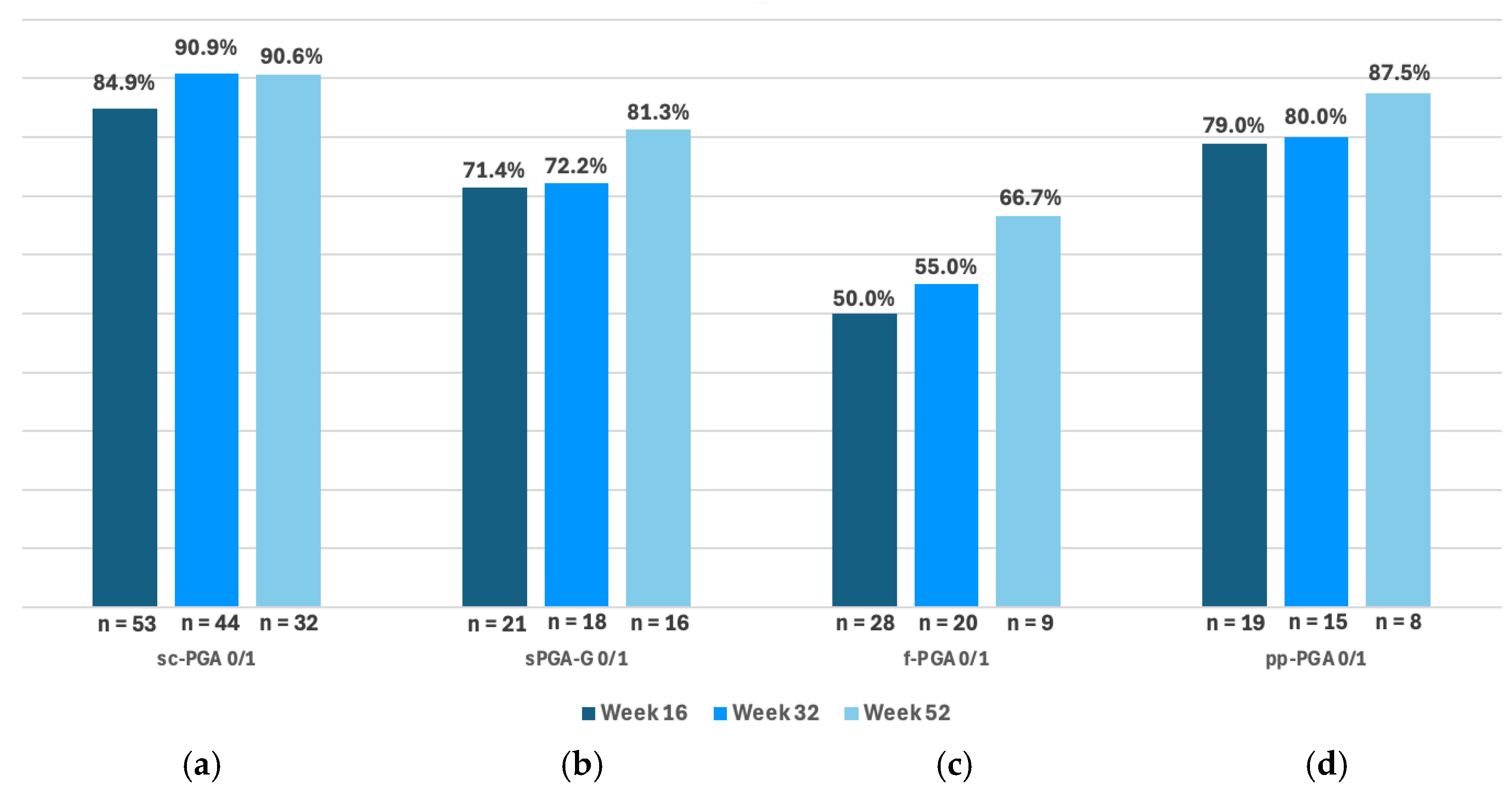 - Orsini, D.; Malagoli, P.; Balato, A.; Bianchi, L.; Brianti, P.; Buononato, D.; Burlando, M.; Caldarola, G.; Campanati, A.; Campione, E.; et al. Bimekizumab for the Treatment of Plaque Psoriasis with Involvement of Genitalia: A 16-Week Multicenter Real-World Experience—IL PSO (Italian Landscape Psoriasis). Dermatol. Pract. Concept. 2024, 14, e2024052. [Google Scholar] [CrossRef] [PubMed]