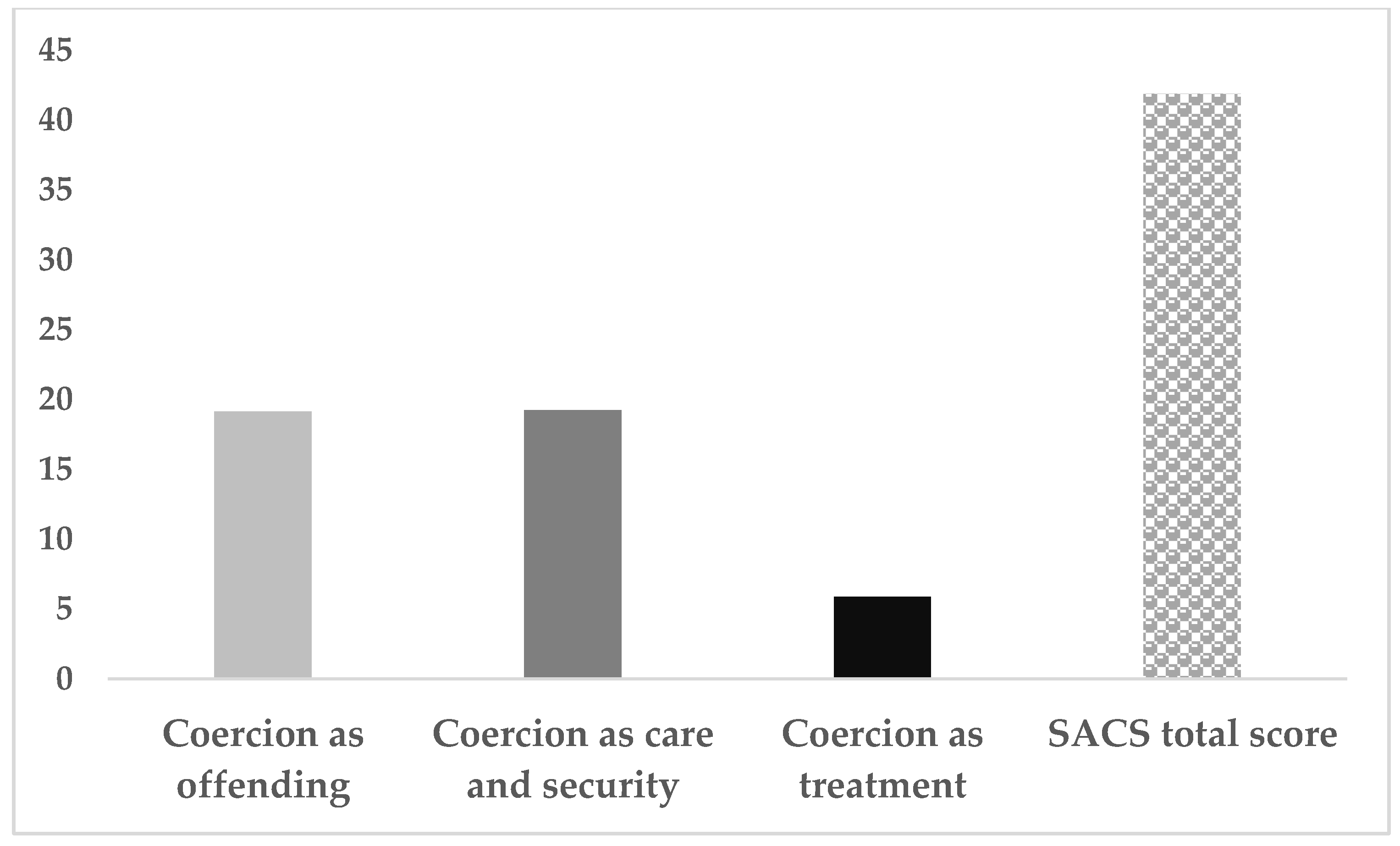 Variables | SACS Total Score (m ± SD) | Coercion as Offending (m ± SD) | Coercion as Care and Security (m ± SD) | Coercion as Treatment (m ± SD) |