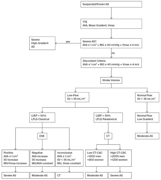 Accurate grading of AS is challenging in LFLG AS including paradoxical LFLG AS with preserved LVEF. Standard echocardiography may underestimate severity when flow is reduced, leading to discordant findings. ESC/EACTS Guidelines (2021) recommend a multimodality approach, with DSE and CT-CAC as key complementary tools [5,38].