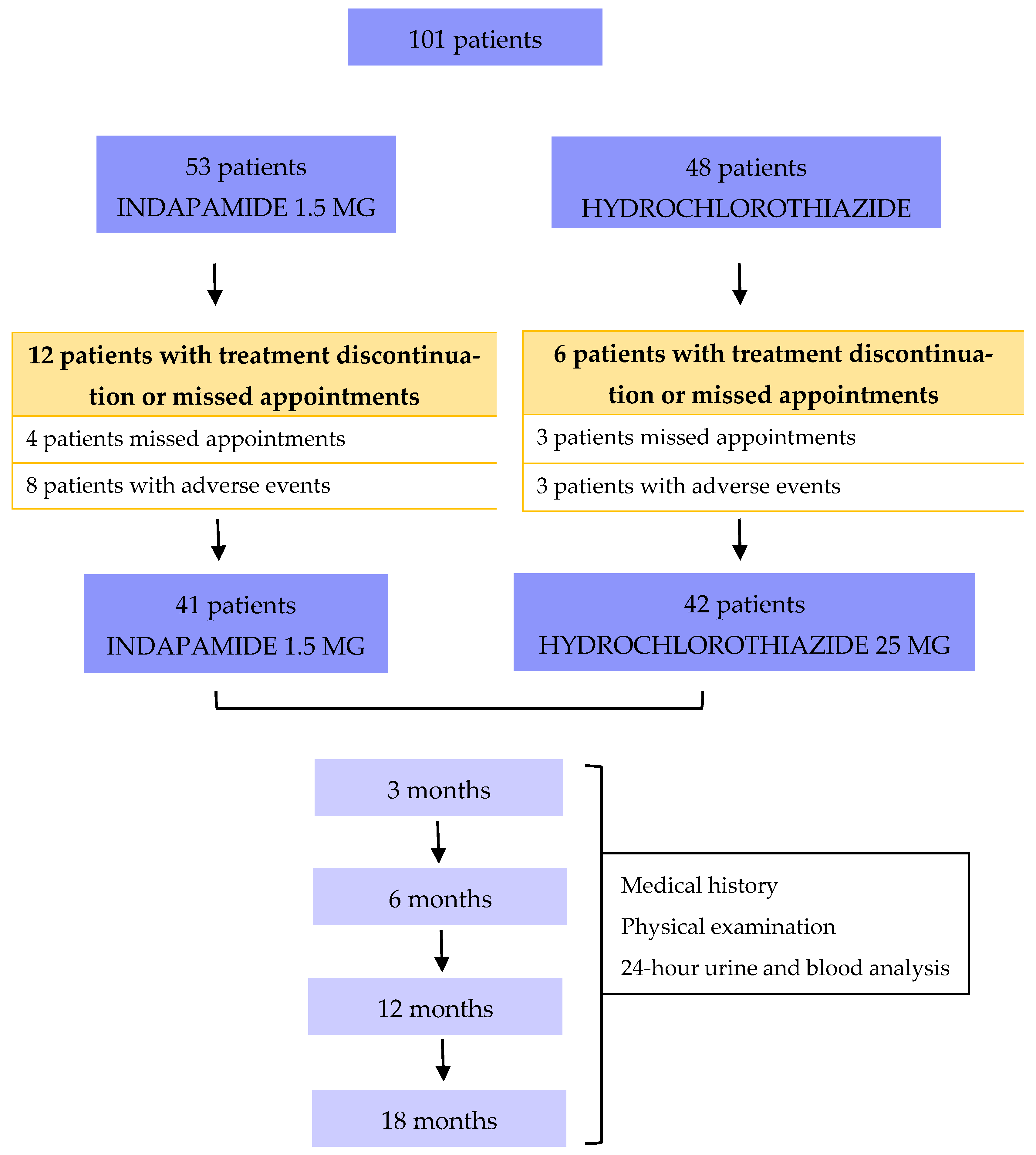 A total of 101 patients matching the inclusion criteria were enrolled and randomized for the study, 53 and 48 in the indapamide group vs. hydrochlorothiazide group, respectively. Of those, 12 and 6 in the indapamide vs. hydrochlorothiazide treatment arm experienced adverse effects leading to treatment discontinuation or missed appointments (