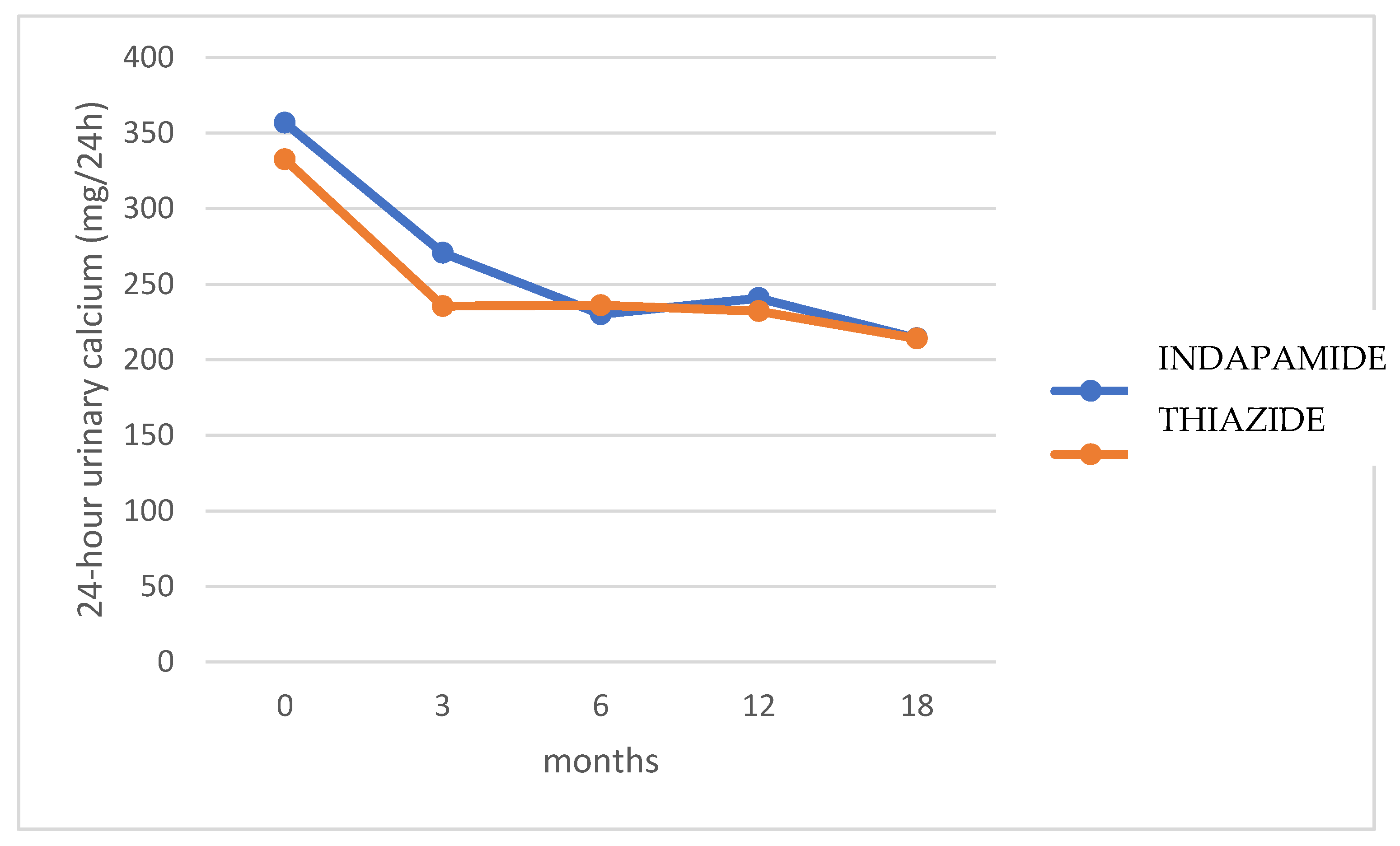 Secondary endpoints included comparing the therapeutic efficacy (reduction in calciuria) between both drugs, describing the evolution of the 24-h urine metabolic study over 18 months, and treatment adherence evaluation. The effect on blood pressure and stone events (pain, requirement for surgical intervention, need for urinary diversion, or medical treatment) was also observed.