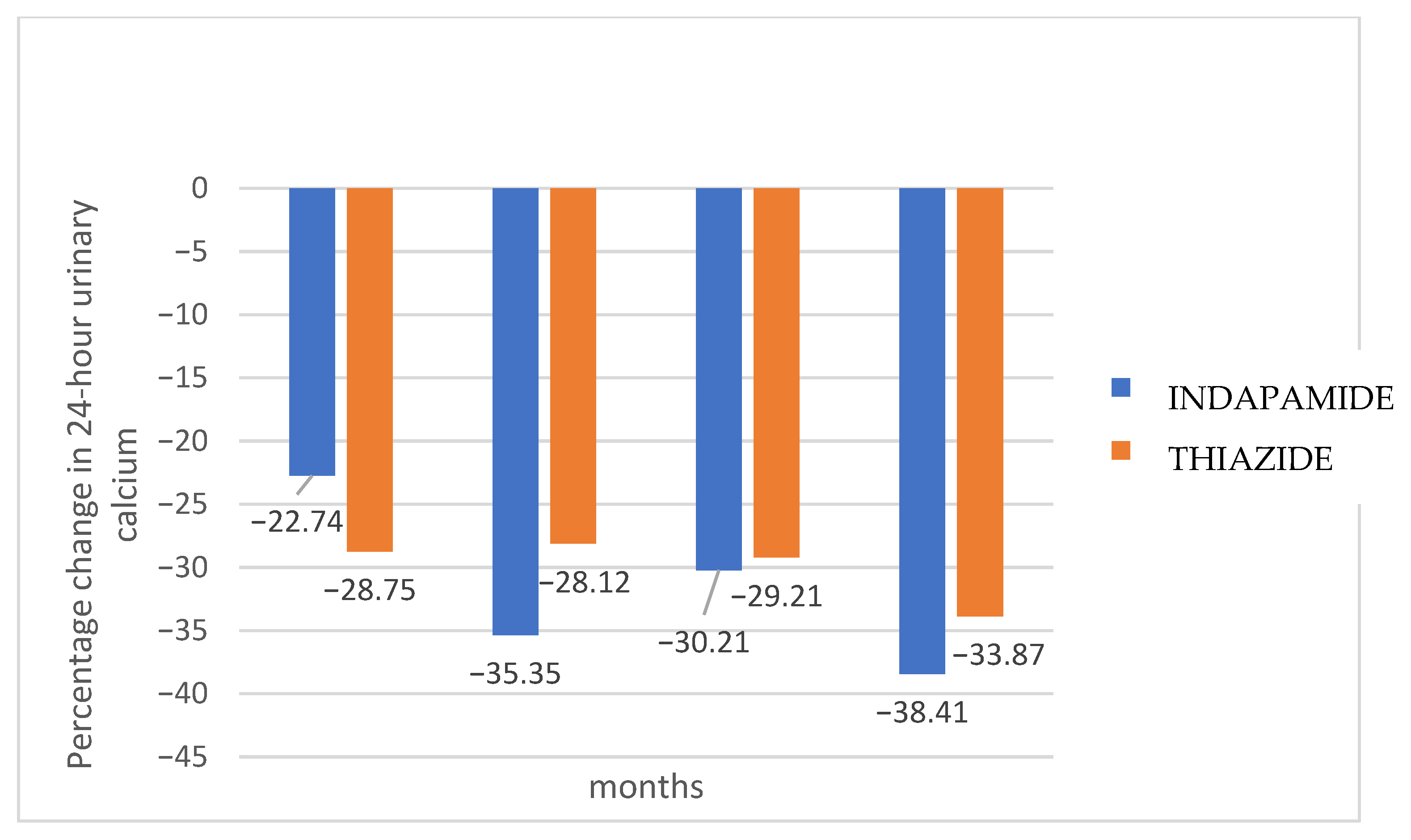 Figure 3 shows the percentage change in 24-h urinary calcium for each treatment group compared to baseline values. Hydrochlorothiazide presented a faster effect in lowering calcium excretion, maintaining it at normal levels from the third month, while indapamide required 6 months. After 18 months, indapamide treatment resulted in a mean decrease of 38.4% (SD 19.8), while hydrochlorothiazide decreased urinary calcium by 33.8% (SD 20.2) (