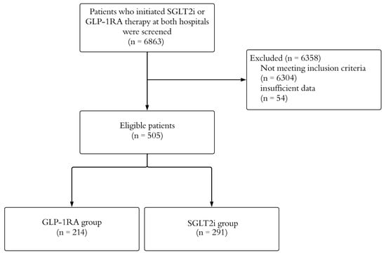 Figure 1 presents the study process flowchart. A total of 6863 patients who had started either SGLT2i or GLP-1RA at both hospitals were screened. After applying the inclusion and exclusion criteria, 505 patients were identified, of whom 291 (57.6%) were treated with SGLT2i and 214 (42.4%) with GLP-1RA. Of the patients in the SGLT2i group, 154 (52.9%) were on dapagliflozin, and 137 (47.1%) were on empagliflozin. In the GLP-1RA group, 164 (76.6%) were on semaglutide, 49 (22.9%) were on liraglutide, and 1 (0.5%) was on dulaglutide. The mean age of the participants was 61.5 ± 10.3 years, 61.4% were female, and 38.6% were male. A significant portion of the participants (86.5%) had a past medical history, with the most common comorbidity being dyslipidemia (81.2%), followed by chronic kidney disease (10.5%). While 5% of the participants had undergone bariatric surgery, 95% had not. Table 1 summarizes the patients’ demographic and clinical characteristics.