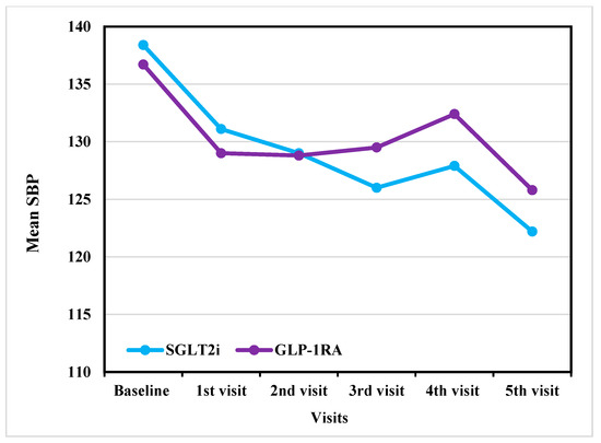 Based on the results of the pairwise comparison, the SGLT2i group demonstrated a significant reduction in SBP between the baseline and fifth visits (p = 0.026). However, no significant differences were observed between the other visits. For the GLP-1RA group, SBP significantly declined between the baseline and second visits (p = 0.024) and between the second and fifth visits (p = 0.022).