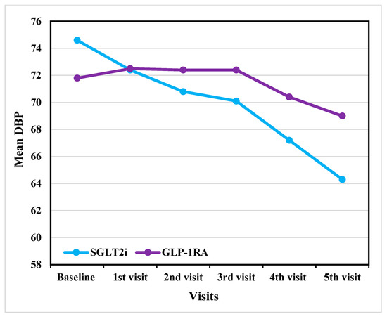 Although the SBP results were significant, neither class showed any statistically significant decline in DBP. For the SGLT2i group, DBP was 67.4 ± 9.4 mmHg at baseline and reached 67.2 ± 10.1 mmHg at the fifth visit (p = 0.719). Similarly, the GLP-1RA group’s DBP was 70.9 ± 11.0 mmHg at baseline and reached 71.8 ± 9.6 mmHg at the fifth visit (p = 0.702).