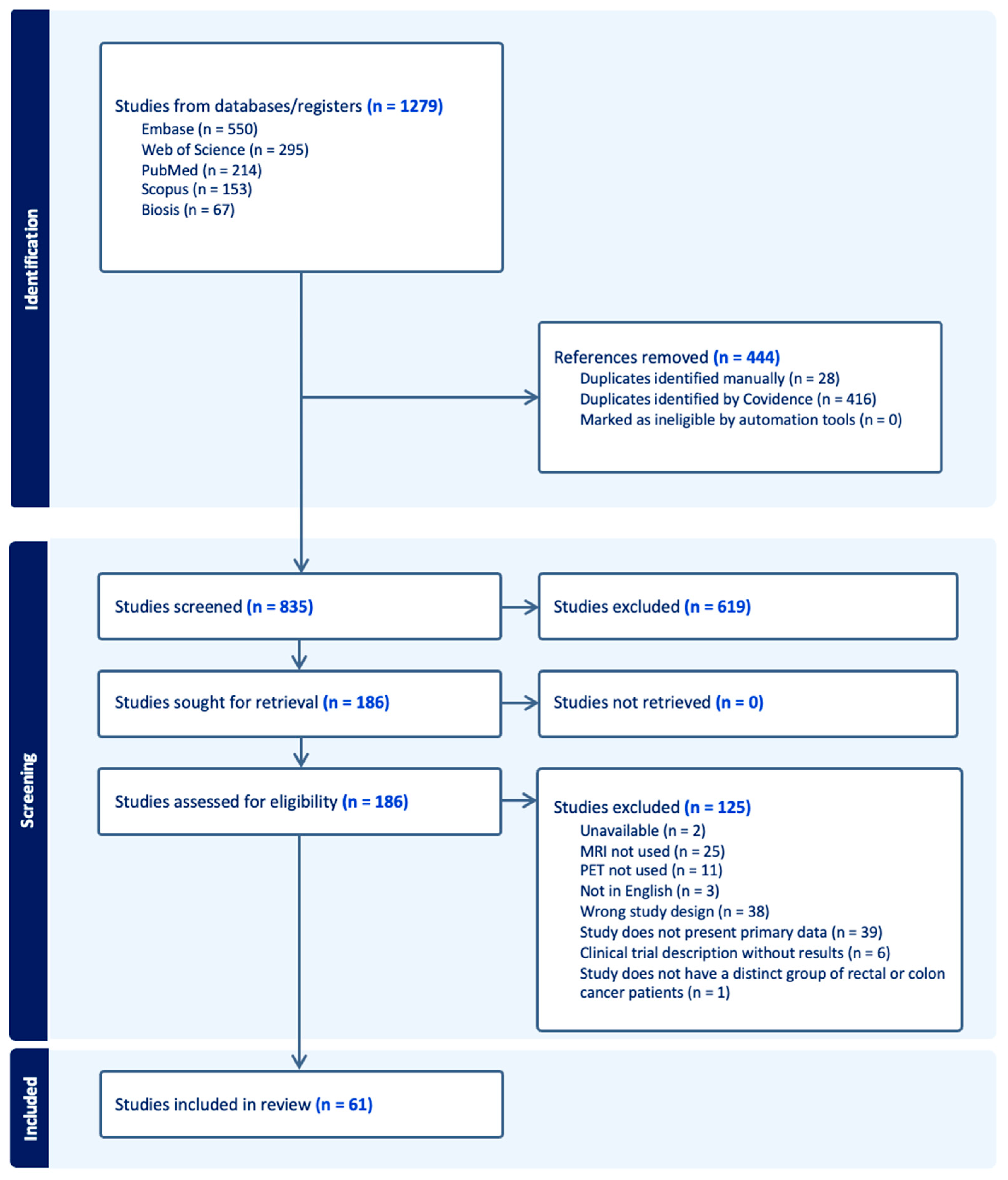 Chen et al. [50] | 2023 | Retrospective study | 357 patients with 30.3% stage 3 rectal cancer and 71.7% receiving neoadjuvant therapy | To assess and compare PET findings with CT and MRI for accurate treatment management | PET/MRI helped provide a treatment strategy compared to CT alone or PET/CT in 21.6% patients; both PET/MRI and PET/CT showed overall accuracy in detecting peritoneal and lymph node metastases |
