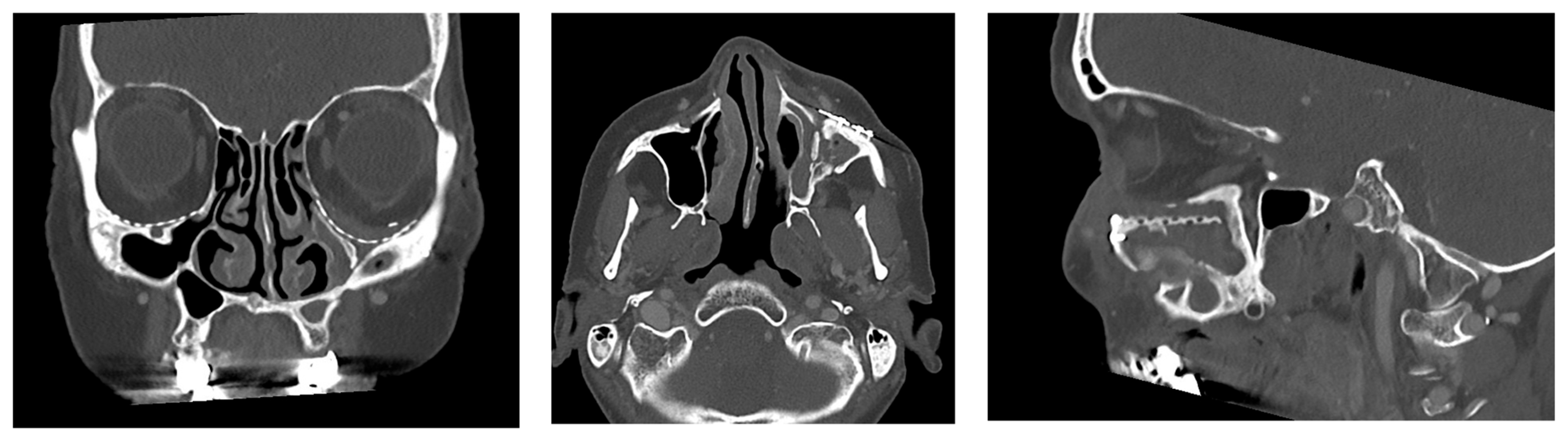 - Strabbing, E.M.; Engin, O.; Telleman, M.A.J.; Nagtegaal, A.P.; Wolvius, E.B. Post-traumatic and iatrogenic silent sinus syndrome: A case series. Oral Maxillofac. Surg. 2025, 29, 106. [Google Scholar] [CrossRef]