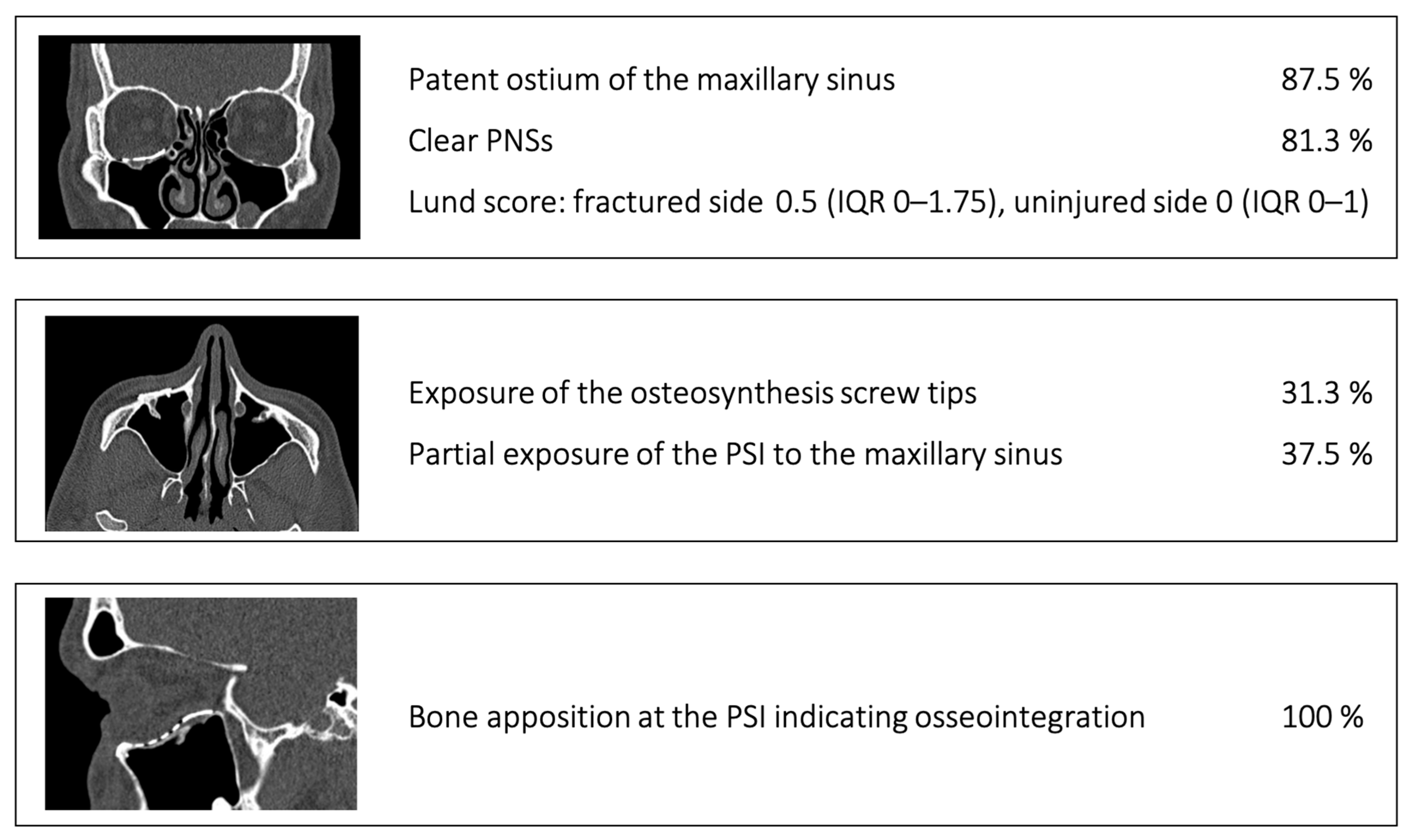 - Exposure of the fixation screws (infraorbital recess of the maxillary sinus) and limited exposure of the PSI (transition zone, ethmoid cells) without signs of mucosal swelling in these regions (n = 6 each)