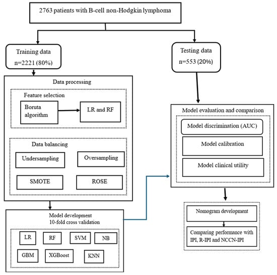 Conceptual framework of the machine learning model development for predicting treatment response of B-cell non-Hodgkin lymphoma. IPI; International Prognostic Index, R-IPI; Revised-IPI, NCCN-IPI; National Comprehensive Cancer Network-IPI, LR; logistic regression, RF; random forest, XgBoost; extreme gradient boosting, KNN; K-nearest neighbour, GBM; gradient boosting, SVM; support vector machine, NB; Naïve Bayes, ROSE; Random oversampling of examples technique, SMOTE; Synthetic minority oversampling technique.